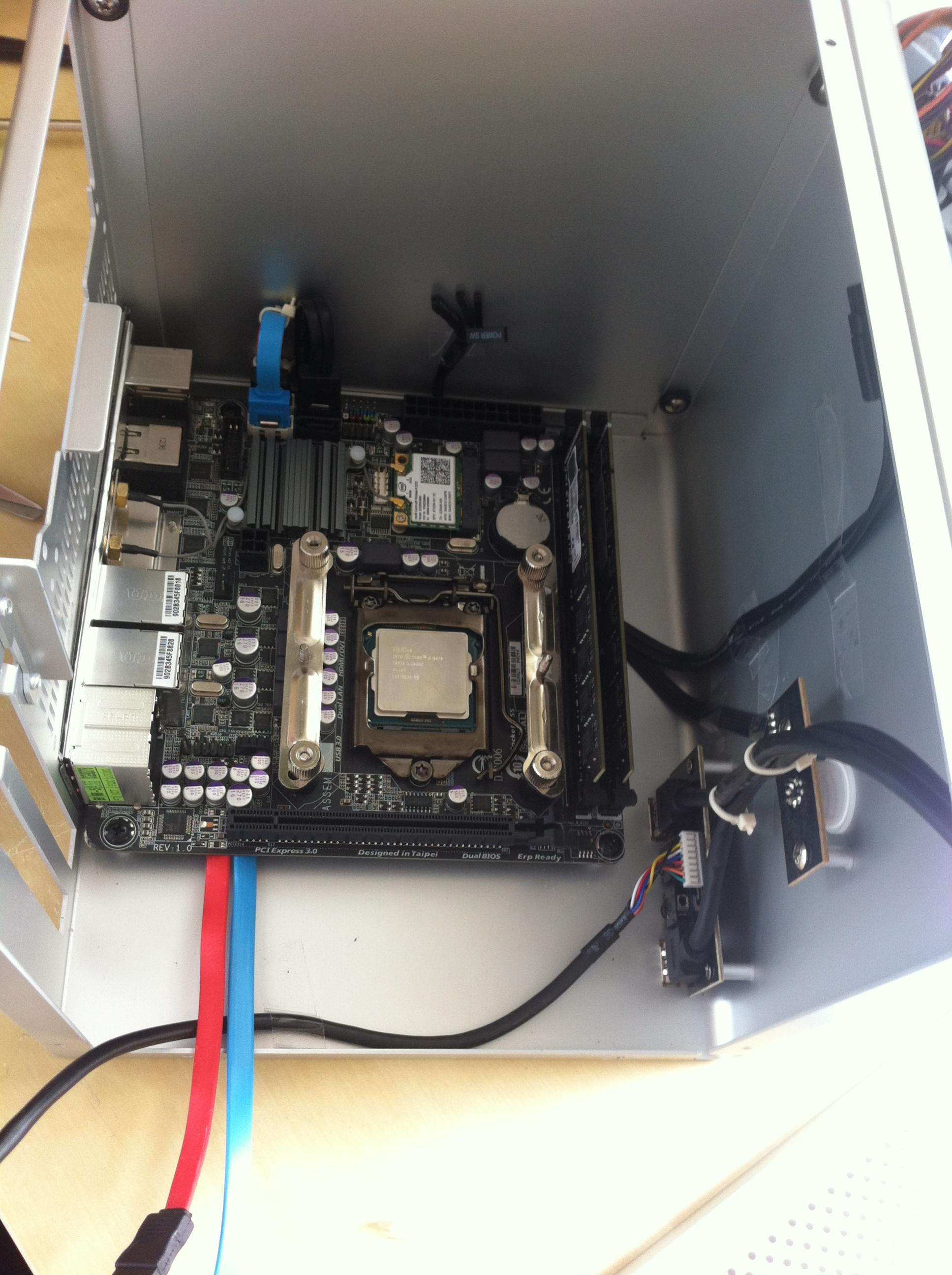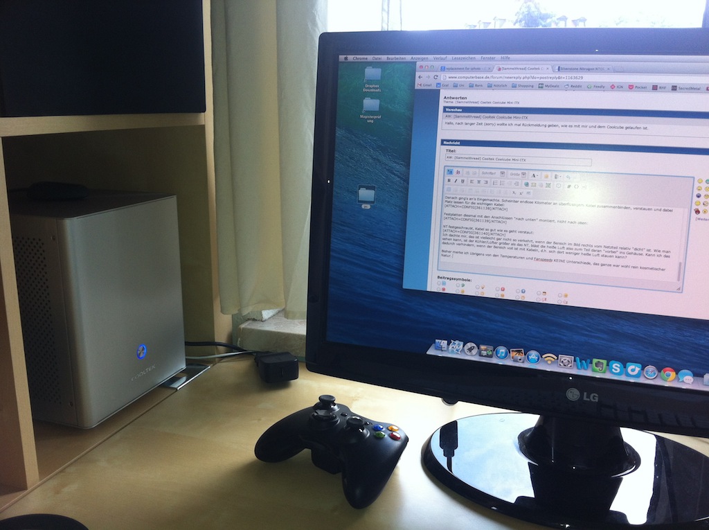 Kurz darauf hatte ich mir auch zum ersten Mal den Coolcube erfolgreich zusammengebaut -- sogar so erfolgreich, dass ich die Front-USB Pins des Mainboards tlw. gekillt hab. Nunja, Kollateralschäden gibt es immer. Ansonsten lief das System allerdings rund. Bei Spielen wurde es natürlich warm, aber nicht besorgniserregend heiß. Im Windows-/Browse-/Office Betrieb ist der Würfel auch angenehm leise dank Gigabytes EasyTune. Mit den bloßen BIOS Einstellungen ists allerdings ein wenig laut bei rund 1450-1600 RPM, weil da die Temperaturen natürlich sofort runtergeschraubt werden. Von daher ist das System als Hackintosh auch eher suboptimal, da es hier keine Software-Lüftersteuerung gibt und man dann mit konstantem Lüftergeräusch leben muss. Allzu tragisch ist's jedoch für mich nicht, wenn man bedenkt, dass ich den Cube ca. 30cm von meinem Kopf entfernt auf dem Schreibtisch platziert habe.