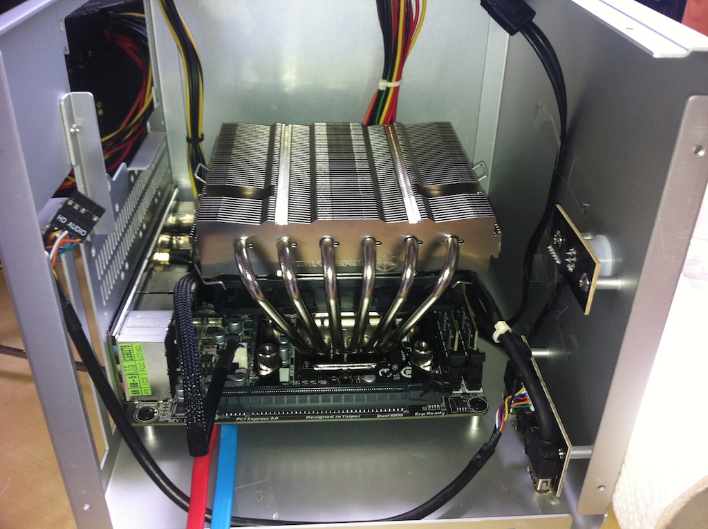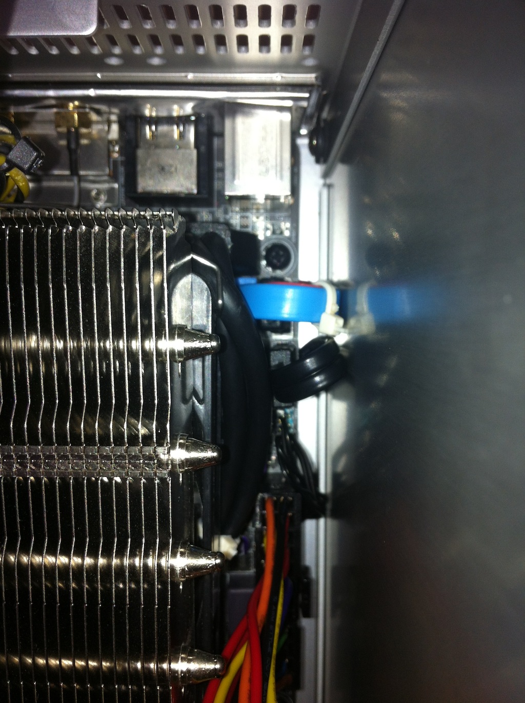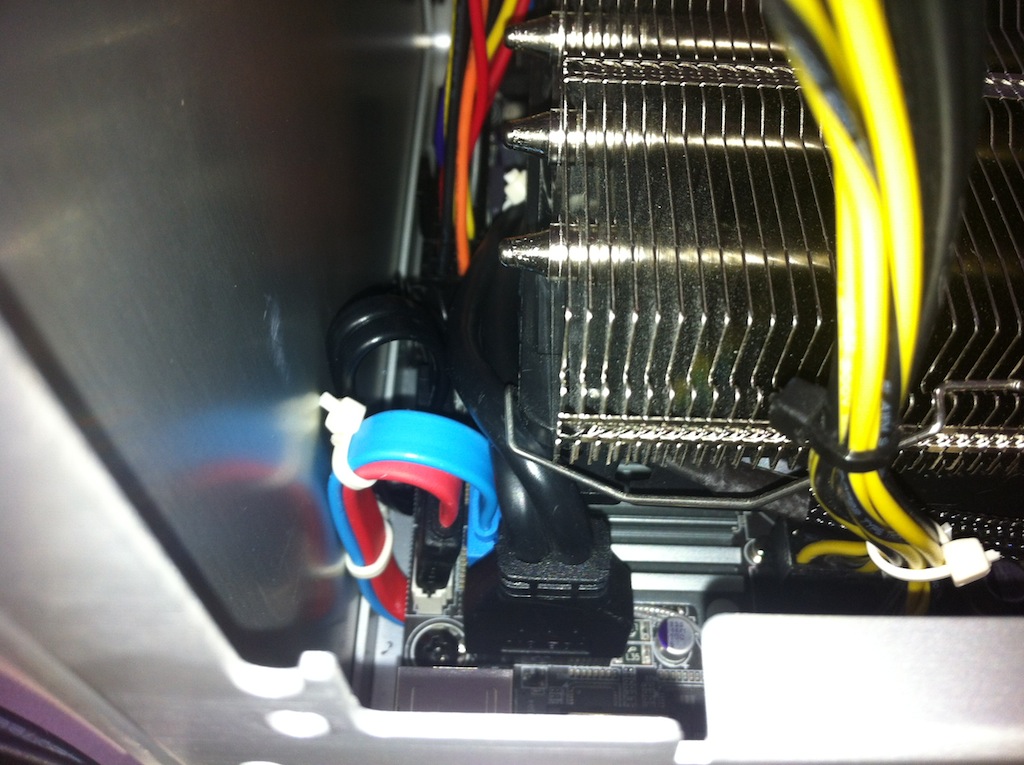 Dann der monströse Kühler, der die Aktion heute zu einer unglaublichen Stressorgie hat werden lassen. Ich muss das Front-USB Kabel einstecken, bevor der Kühler drauf kam. RAM ebenfalls. Das USB-Kabel war nervig kurz, sehr steif und drück ordentlich gegen den Lüfter. War ein Heidenspaß, das Teil festzuschrauben und dabei auf die Wärmeleitpaste aufzupassen. Never again...