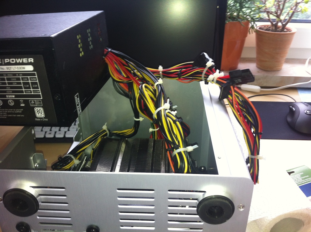 Was mich bis heute allerdings auf die Palme gebracht hat, war mein sogut wie garnicht vorhandenes Kabelmanagement. Drum entschloss ich mich, den Rechner heute neu zu verkabeln und trotz nicht-modularem NT ein wenig Kabelmanagement zu betreiben. Vielleicht würde es damit ja auch ein wenig kälter werden im Kubus...