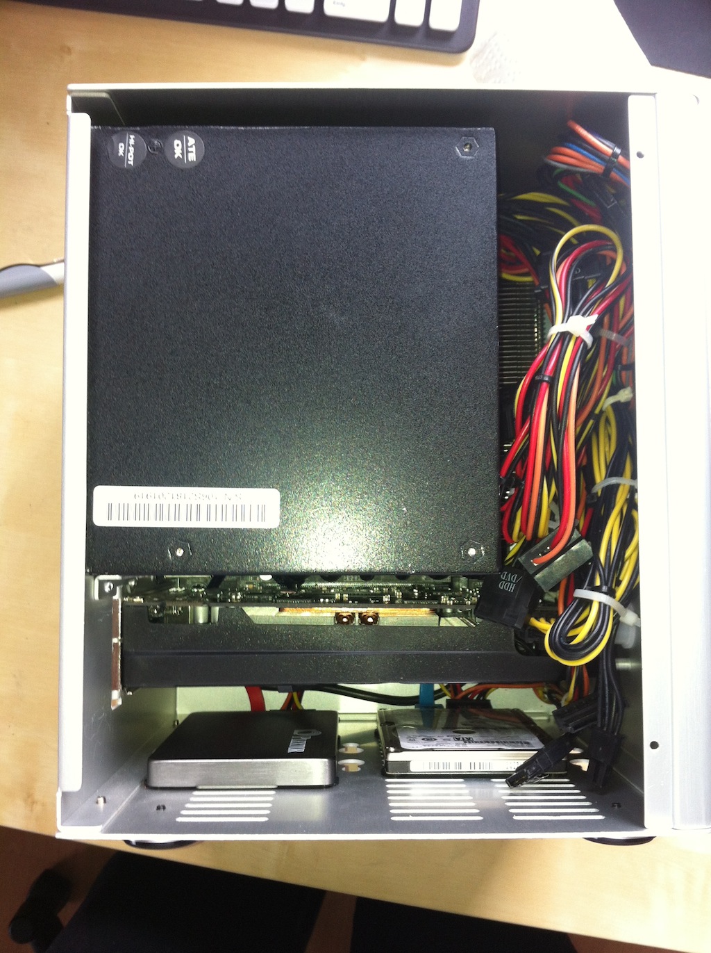 Habe beim Neu-Zusammenbau versucht, kein Kabel über der Grafikkarte zu verlegen (beim letzten Mal hatte ich die SATA Kabel oben rum verlegt und die lagen dann sehr eng an deren Platine an). Für das Front-Audio Kabel hab ich auch ein nettes Plätzchen gefunden: