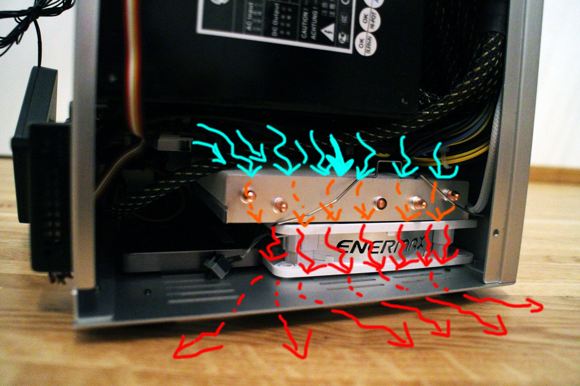 Egal wie man die Wärme abschirmt / raussaugt / was auch immer, im Endeffekt braucht die Grafikkarte bis zu 170 Watt, wodurch es in der Natur der Sache liegt, dass das Netzteil warm wird und die interne Lüftersteuerung hochfährt! Es ist jetzt nicht wirklich laut, aber rauscht halt trotzdem...