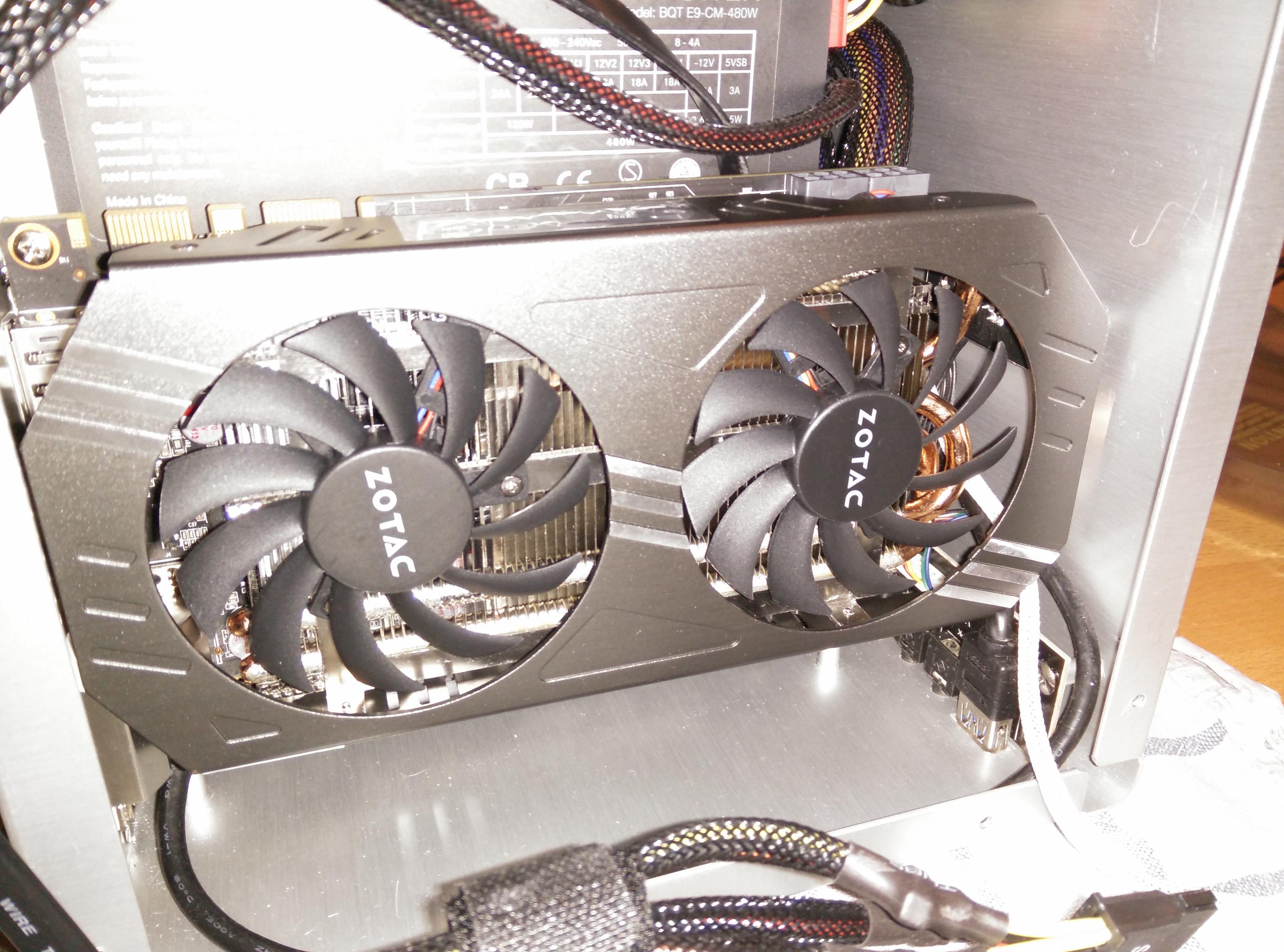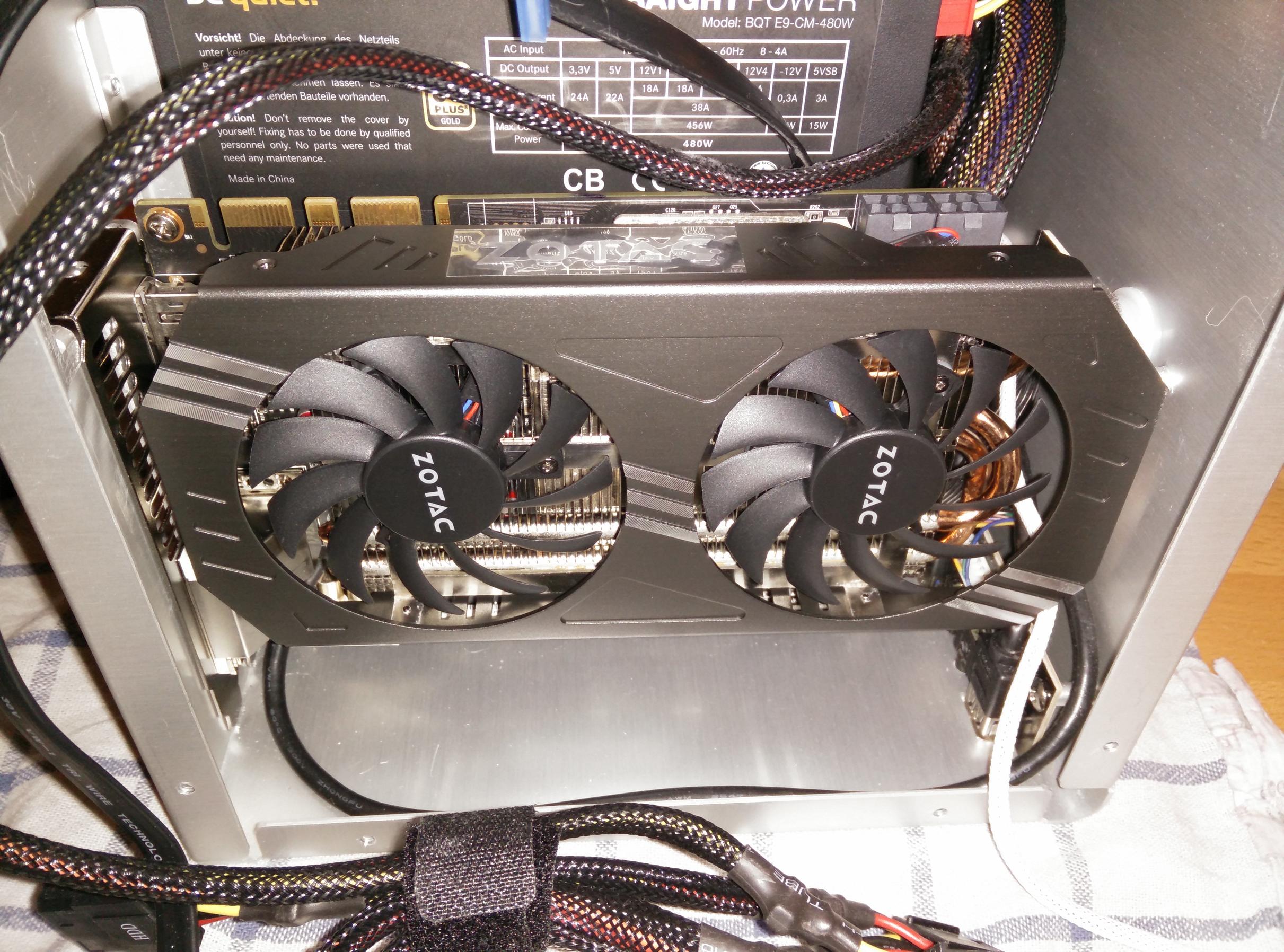 Wenn du als Case das Cooltek U2 nehmen würdest, könntest du als Graka einfach eine Zotac GeForce GTX 970 out-of-the-box verwenden und hättest außerdem nicht das Problem mit der Gehäuseentlüftung. Ein Silent-NT wie z.B. das Straight-Power 10, bei dem der Lüfter nur mit 200/300 rpm dreht, macht für den Coolcube nämlich nicht unbedingt Sinn.