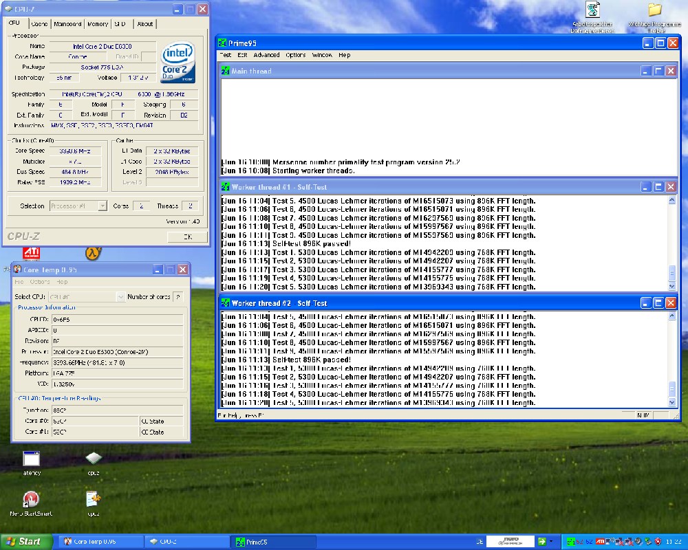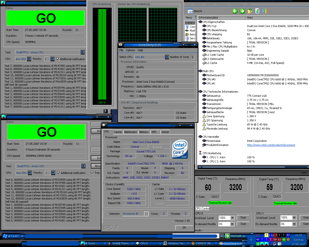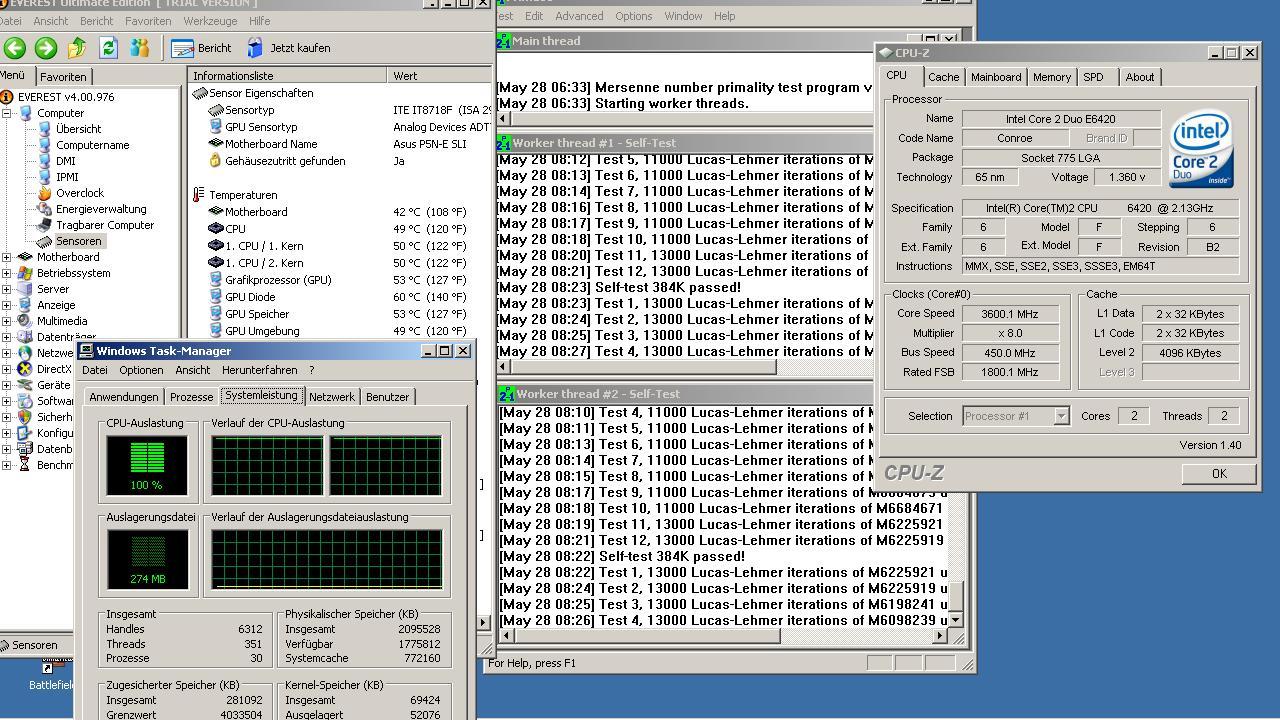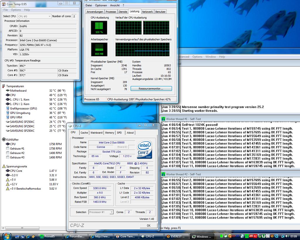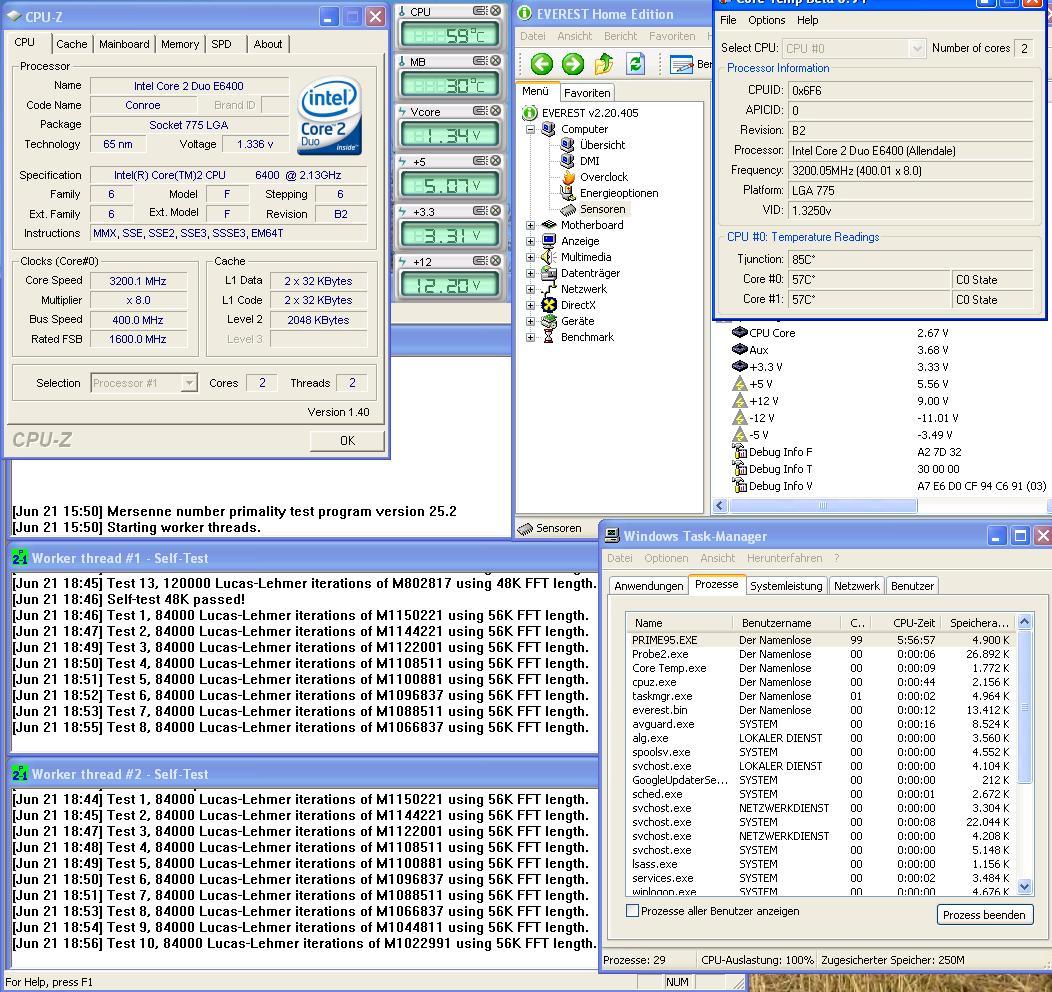 So, nun habe ich gerade bemerkt, dass ich Hornochse Everest so eingestellt habe, dass man die VCore nicht erkennt. Everest zeigt aber die gleiche VCore an wie CPU-Z. Ausserdem wird es Zeit für einen größeren Monitor, da man ja so viele Fenster aufhaben muss...