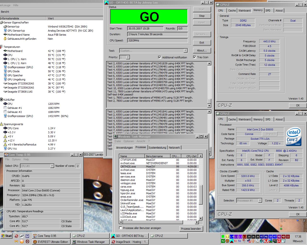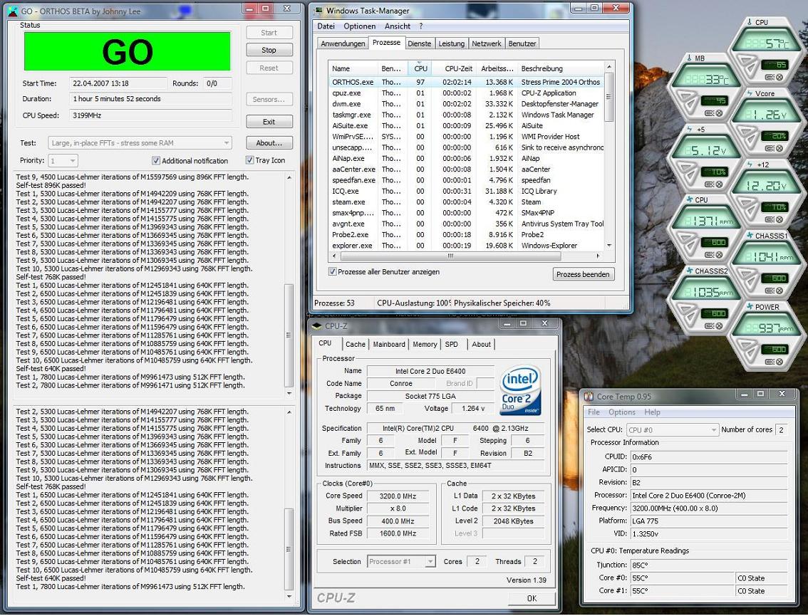 Intel E6600 "Conroe" 9 x 356 = 3204MHz @ 1.232v @ ca.50°C(schwankt könnt euch einen wert aus den screens aussuchen, weis nicht was da am genausten ausliest) - Thermalright Ultra-120 eXtreme - ASUS P5B Deluxe Wifi/AP Rev 1.03g - BIOS 1101 - MöCkY
