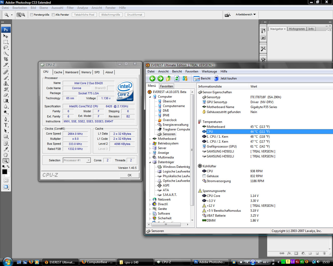 Habe einen E6420 @ 2664mhz @ 1,1175 (wurde im Bios eingestellt ka warum everest das so hochrundet). Die Temp beträgt nach 2,5 stunden dauerprime immer noch max 45° (26° Raumtemp) und 31-35° im Idle. Als Lüfter verwende ich einen Scythe Ninja.