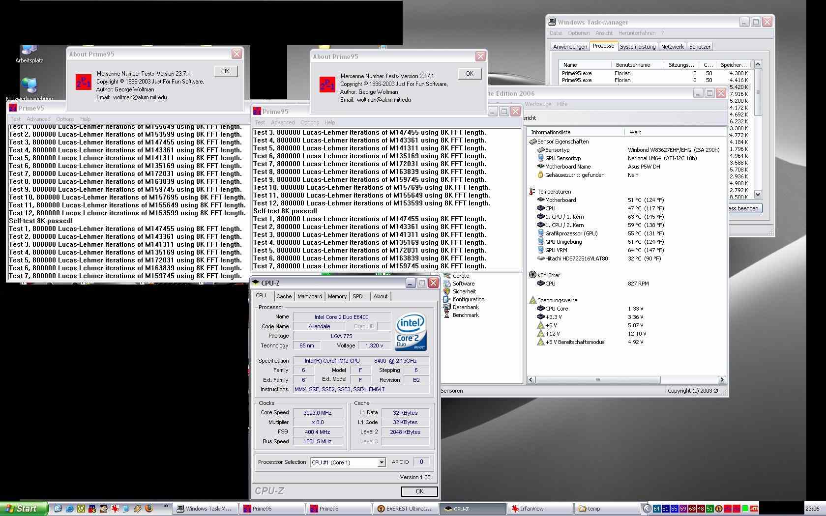 So also: P5W DH Deluxe (Bios 0801) mit E6400 @FSB400 @1,375Vcore (laut Bios) mit einem 1024er MDT DDR2-800 Chip @63°C bzw. 59°C lüftgekühlt mit SI-120 und nem schönen FGLL Papst 120er. NB passiv.