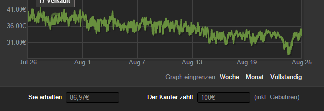 Wenn ich nen Skin für 100€ rein stell, bekomm ich knapp 87€ -< 13% Abzug.