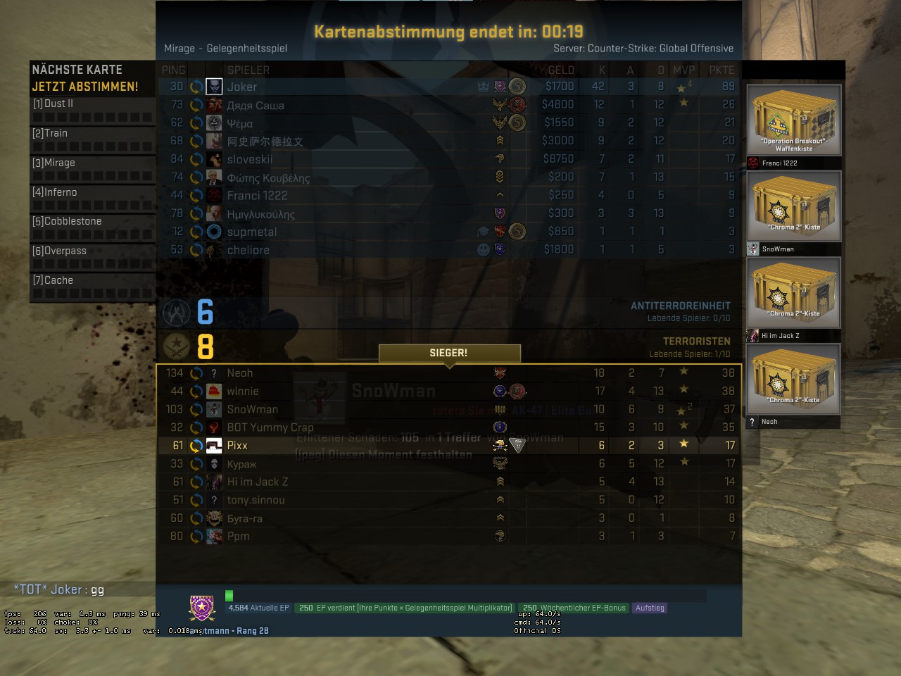 Aber bestimmt wieder schön Reports gesammelt, hatte 3 Noscopes gemacht, zwei davon richtig dreist um die Ecke gekommen, geduckt und einfach abgedrückt, weil ich schon wusste, wo der Gegner war.