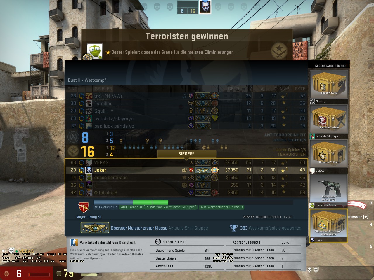 Pjack schrieb:Lol, 2 Draw, 6 Loses und immer noch kein Downrank, jetzt 3x easy mit Premates gewonnen. Wobei die Ranks im letzten Game auch mega strange waren, wir alle Supreme, im Gegnerteam 1x Supreme, 1x DMG und 1x LE...die anderen beiden schon geleavt, müssen dann ja aber beide Global gewesen sein...