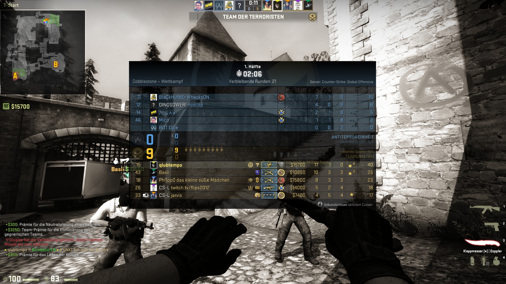 Sehe seine Wiederholung, er stept aus Richtung CT rein (war bei mir definitiv noch nicht zu sehen), aus seiner Ansicht in der Wiederholung bin ich auch schon lange nicht mehr zu sehen, er schießt und kriegt den Kill.