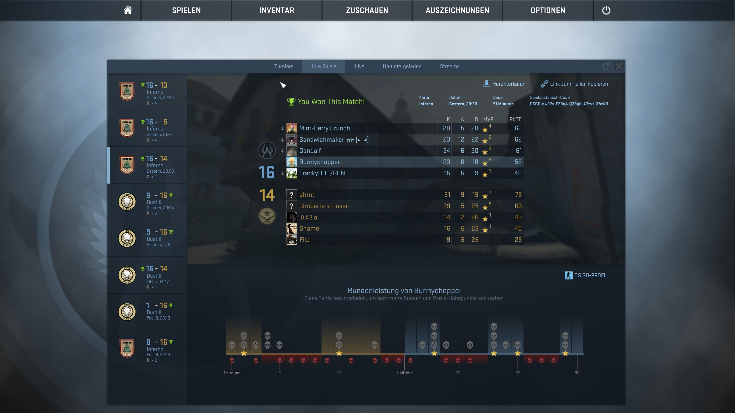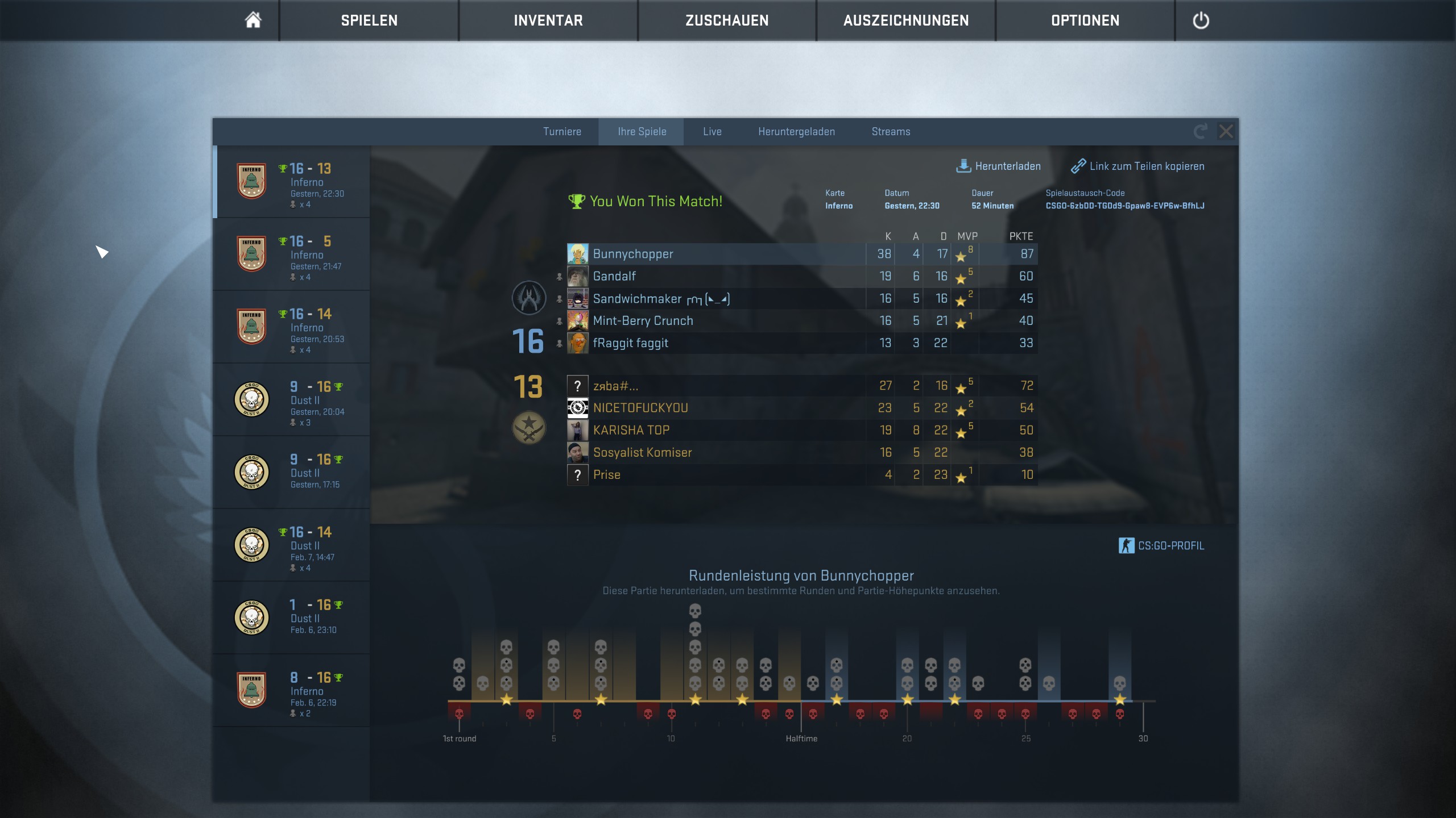 Irgendwann nachm Seitenwechsel ist er dann wegen zu viel Teamdamage raus geflogen, weil er ne Nade verworfen hat. Zu dem Zeitpunkt hatte ich schon fast doppelt so viele Kills wie er, er war vorletzter im Scoreboard und wir waren am gewinnen.