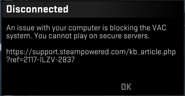 Ich habe ein Problem mit CSGO und hoffe, dass mir jemand helfen kann. Und zwar habe ich sporadisch einen VAC Fehler: "An issue with your computer is blocking the VAC system. You cannot play on secure servers."