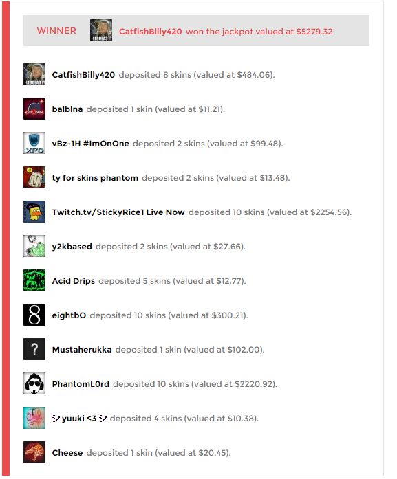 Du setzt Skins (Maximal 10 Stk, die Minimum ein Wert von 10$ zusammen haben müssen) und damit hast du eine Chance auf den Jackpot. Je nachdem wer da noch so mitbietet. Umso höher dein Einsatz umso höher die Chance zu gewinnen. Bei dem Screen da oben von Sikk hatte der mit 2,2k eine Chance von 38%. Also der mit 400$ Einsatz hat schon extrem viel Glück gehabt