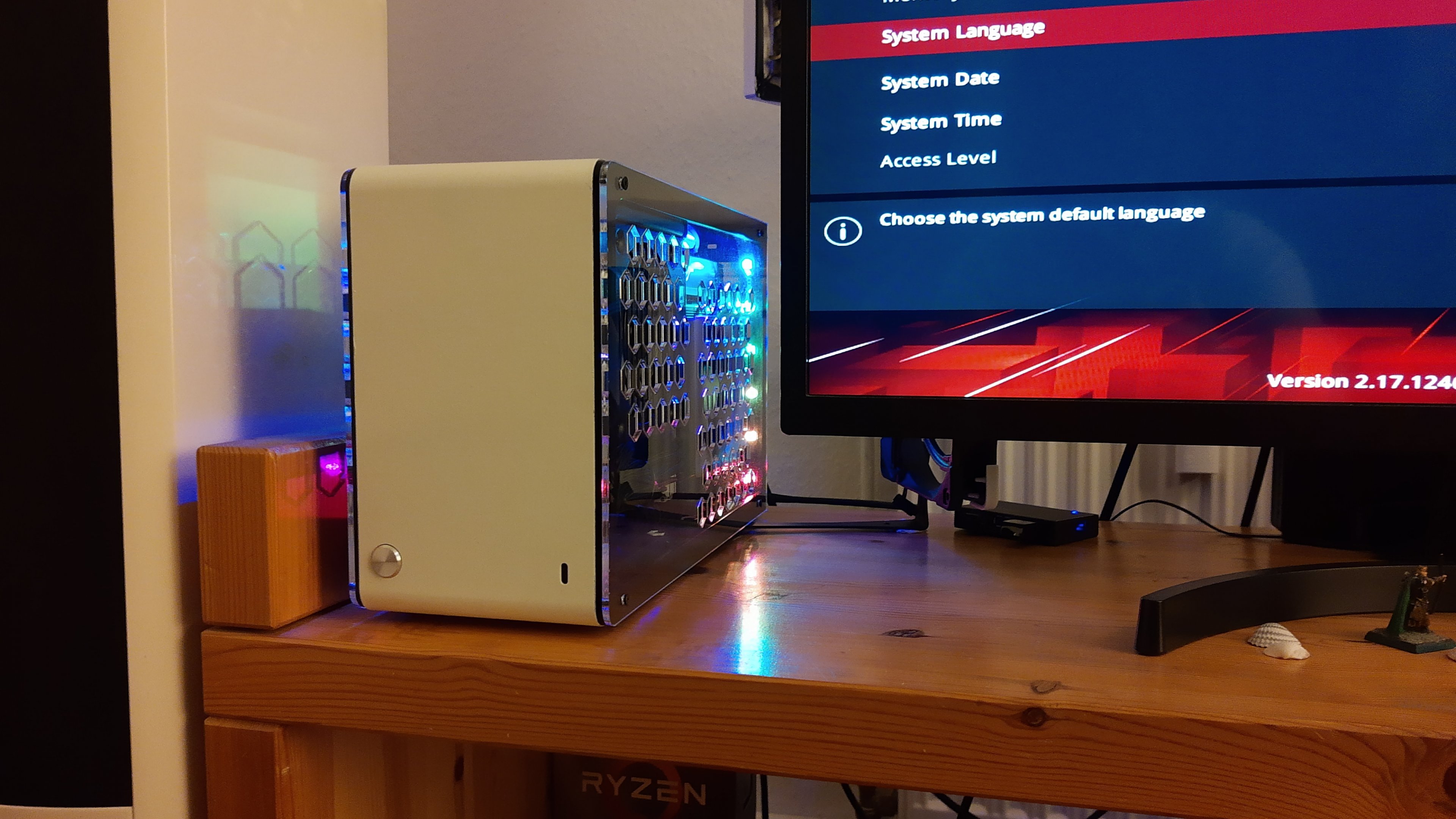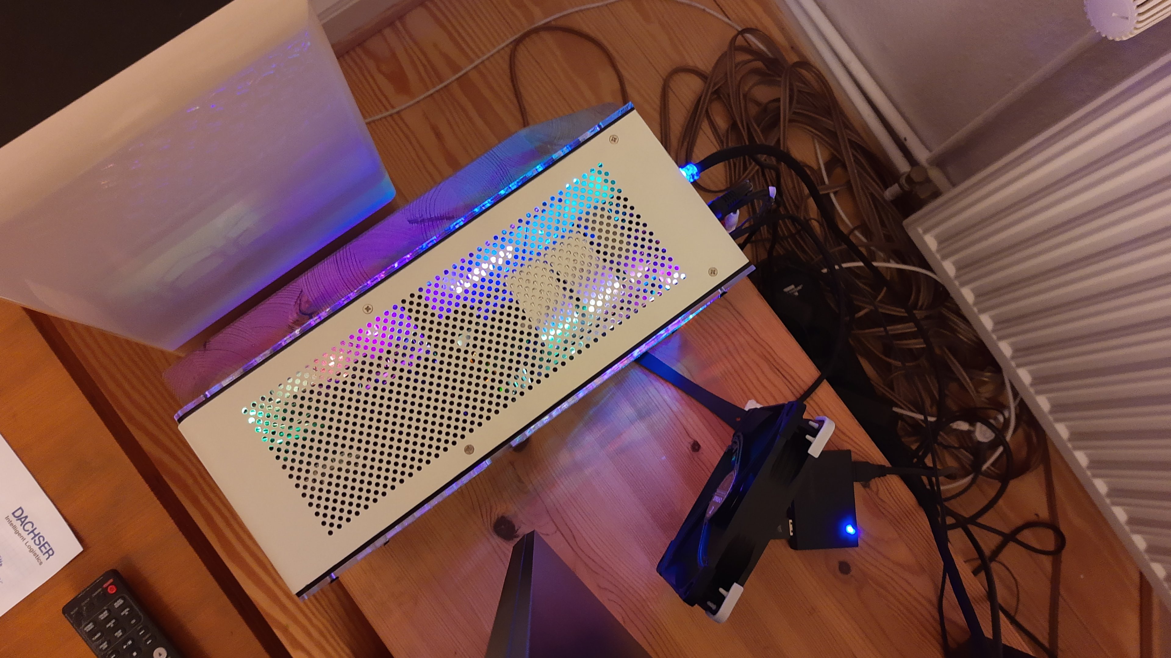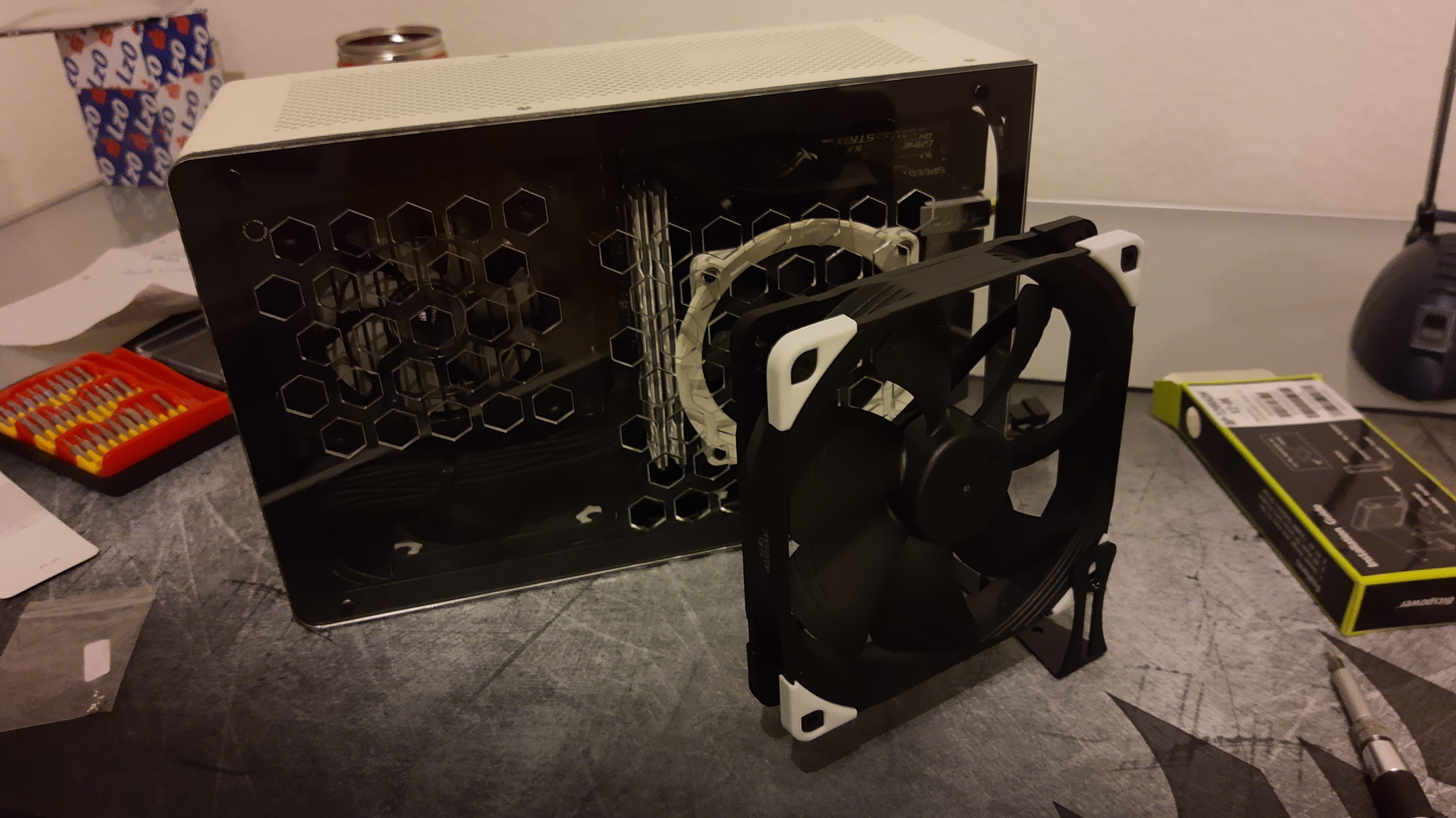 Dan Case A4 SFX V4.1, Asus ROG Strix X470i Gaming, Ryzen 3 3300X @50Watt "Powerlimit", Noctua L9a, 32GB Crucial Ballistix Sport LT @3600CL16, 256GB Samsung 970 EVO, 1TB Crucial MX500 (vorne eingebaut), 2x Noctua 92x15 unten ausblasend mit ca. 800rpm, Corsair SF450, Gigabyte RTX 2070 mit getauschten Pads, WLP und eigener Lüfterkurve und UV.