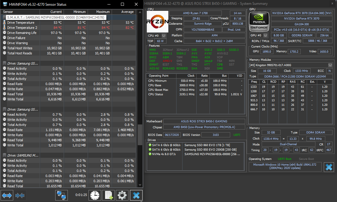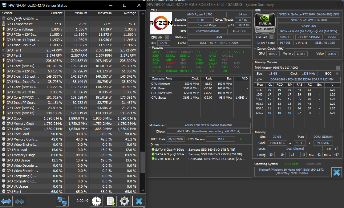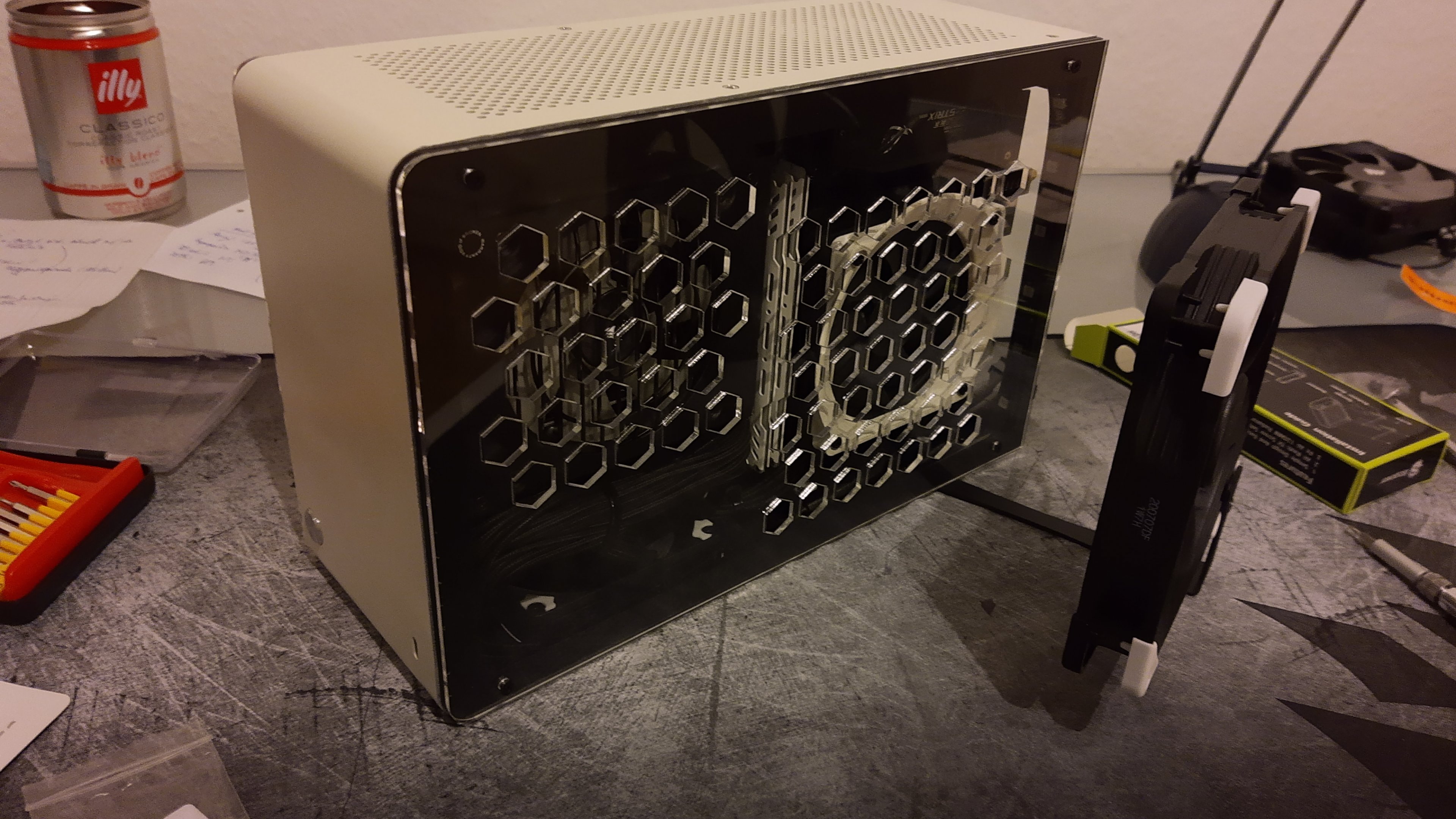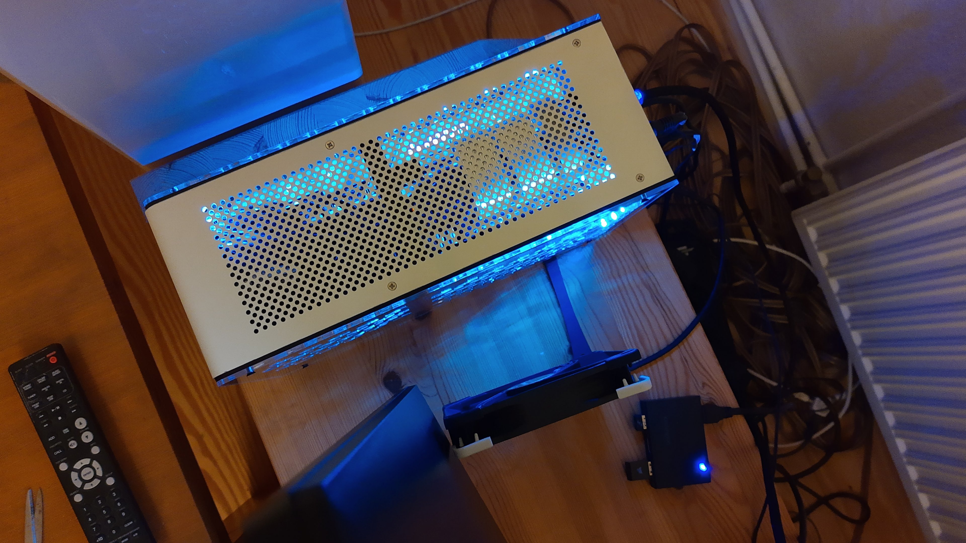 Dan Case A4 SFX V4.1, Asus ROG Strix X470i Gaming, Ryzen 3 3300X @50Watt "Powerlimit", Noctua L9a, 32GB Crucial Ballistix Sport LT @3600CL16, 256GB Samsung 970 EVO, 1TB Crucial MX500 (vorne eingebaut), 2x Noctua 92x15 unten ausblasend mit ca. 800rpm, Corsair SF450, Gigabyte RTX 2070 mit getauschten Pads, WLP und eigener Lüfterkurve und UV.