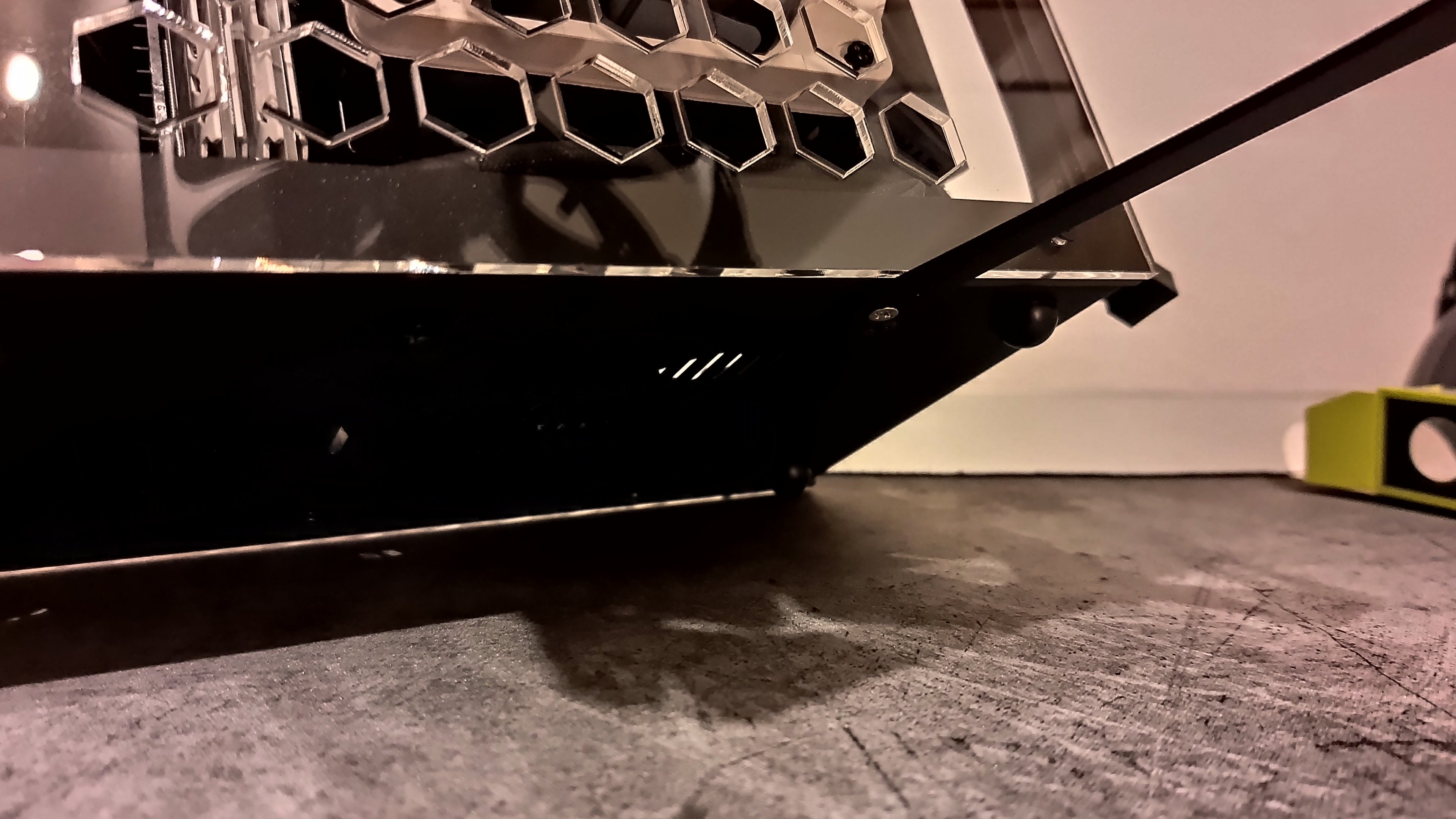 Also habe ich mir letztes Wochenende die beiden 120mm Corsair-Lüfter geschnappt, die aus meinem Zweitrechner mit Corsair Crystal 280X rausgeflogen sind, geschnappt und über ein Y-Kabel am freien AiO-Pumpenanschluss angeschlossen. Ding beiden Jungs haben erst mit 100%, dann mit 60% auf die recht offen gehaltene Seite der Acrylfenster von Pat gepustet, was bei leisen 60% folgende Folgen hatte:
