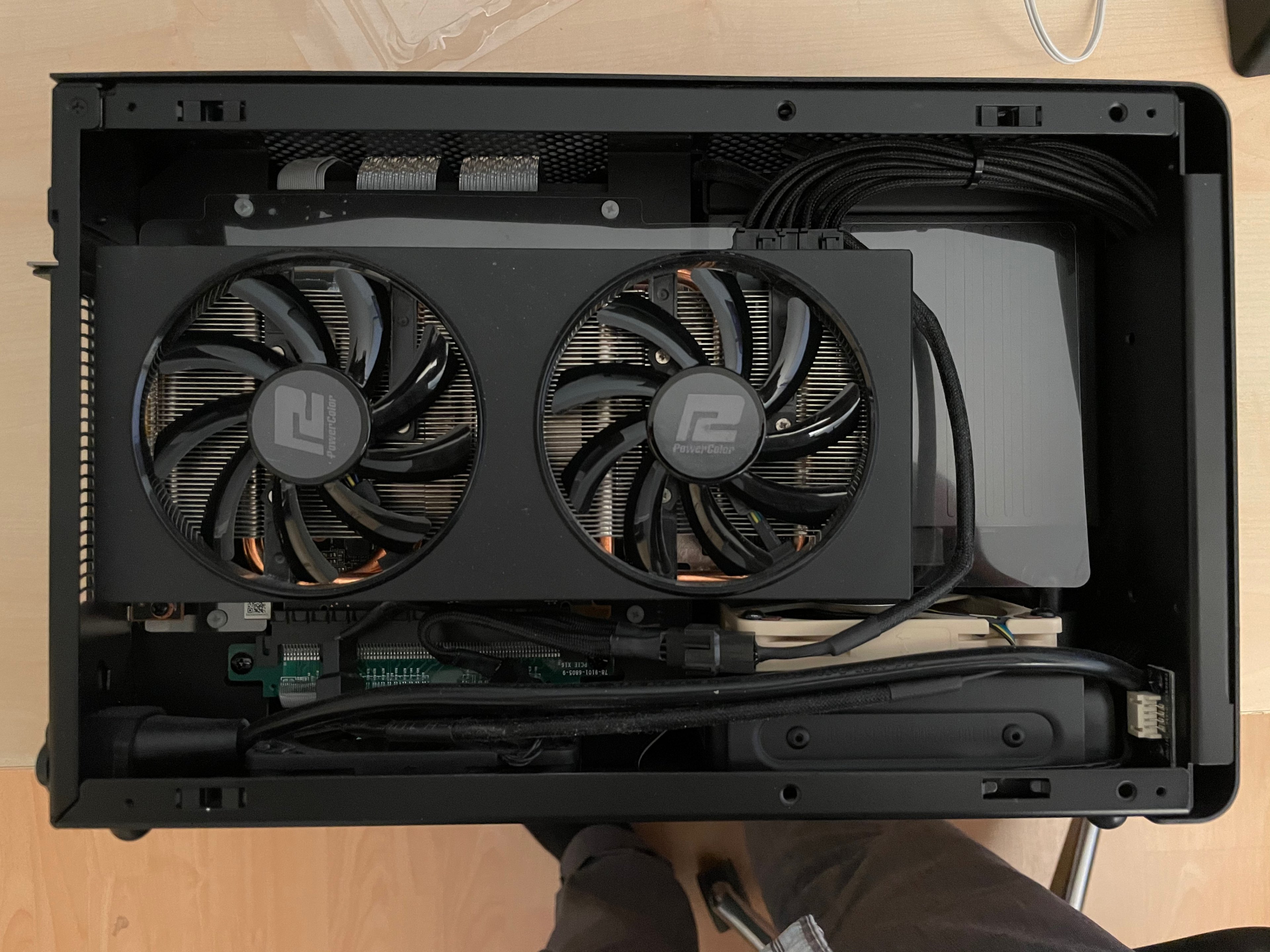 Wenn Du eh beide da hast, würde ich es testen, auch wenn das Flow Through-Design Nachteile haben sollte. Die Plastiktrennung sollte auf jeden Fall eingebaut sein, damit die warme Luft dann nicht das Netzteil aufheizt.