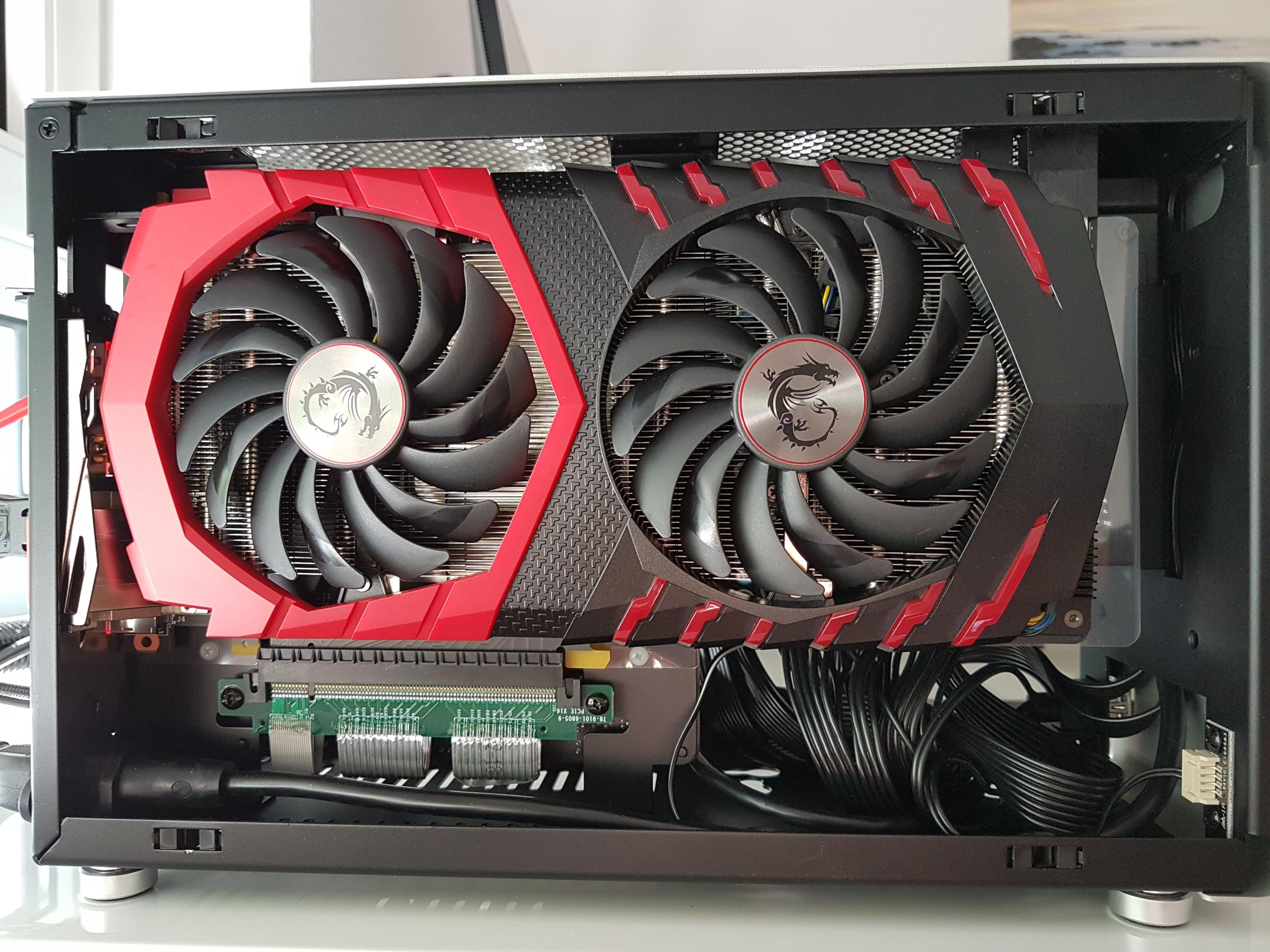 Als ich gestern meinen CPU Kühler noch mal getauscht habe, ist mir eine lustige Idee für einen Gehäuselüfter im Dan Case gekommen (falls die Idee schon irgendwo aufkam hab ich sie wohl über sehen): Unterhalb der Pcie Riser einen einblasenden 92mm Lüfter, was dann wie folgt aussehen würde: