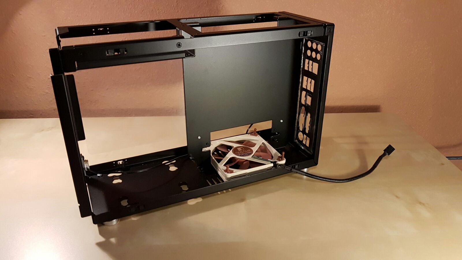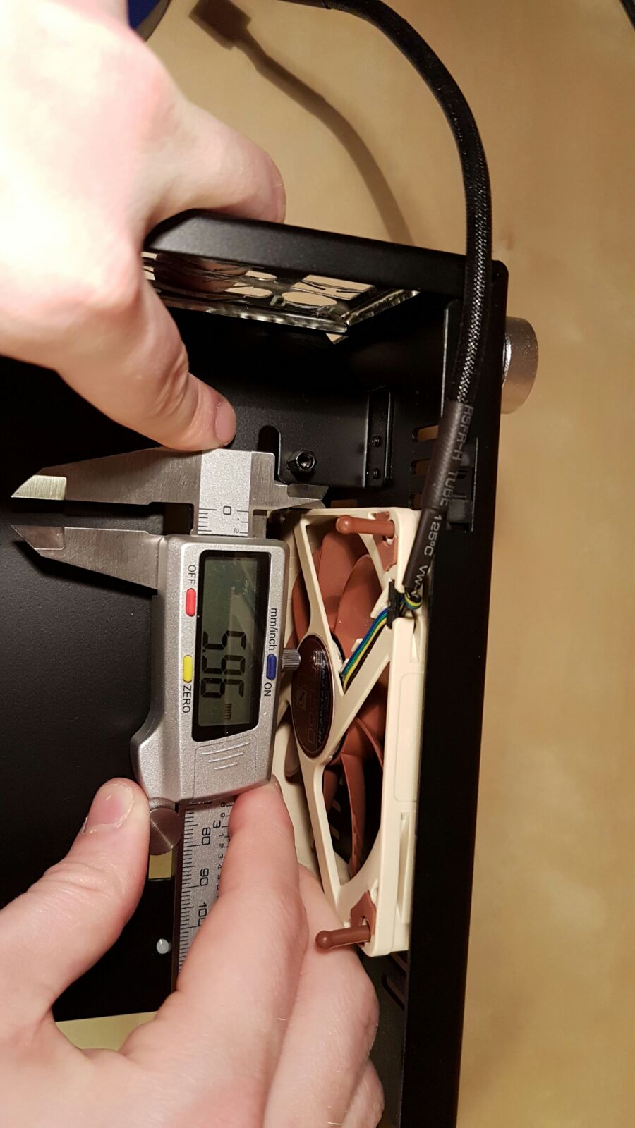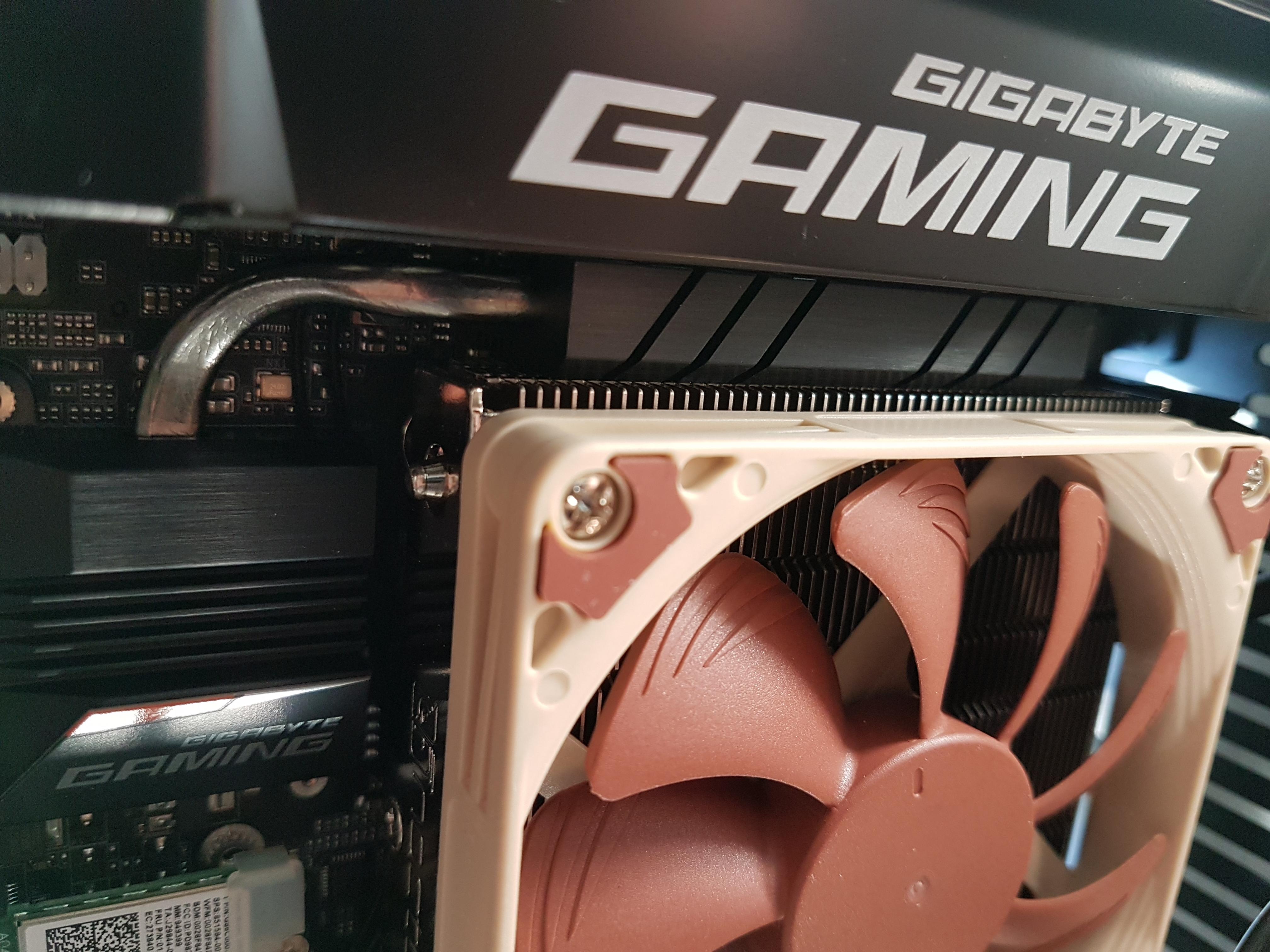 Leider musste ich dann schnell feststellen das der 14mm dicke Lüfter mit dem Mainboard kollidiert, jedoch ein 10-12mm tiefer Lüfter wäre evtl. möglich. Hatte dann an die Scythe Kate jyu slim gedacht der 100x12mm groß ist, jedoch reicht der Platz ganz knapp nicht aus: