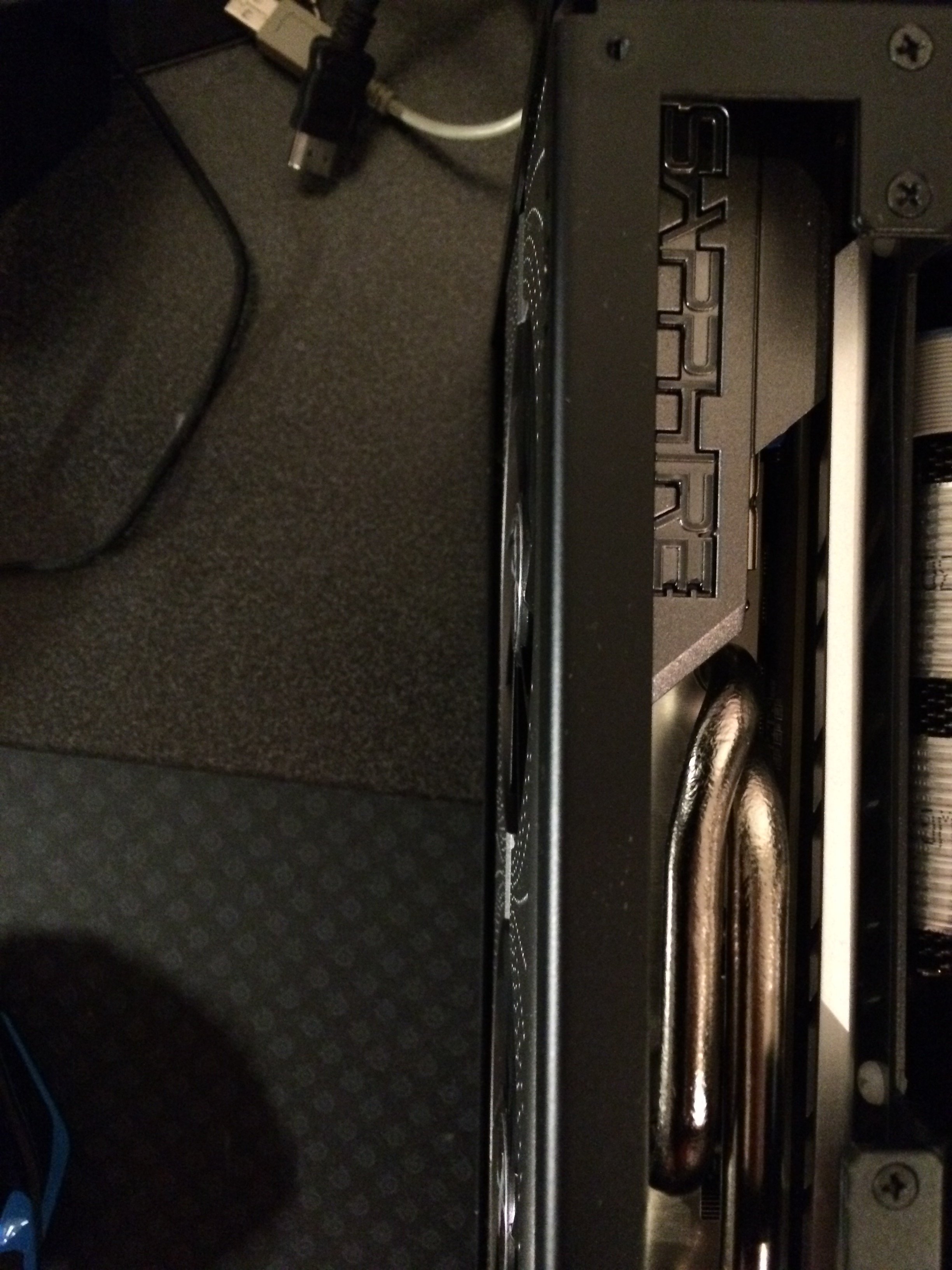 Beim Einsetzen des Scythe Lüfters viel mir besonders auf, dass der Lüfter bündig mit dem normalen Case abschließt und somit eine Palit GTX 980 Jetstream mit 2x Scythe 12mm Lüfter sogar mit einem normalen Seitenteil in das Dan A4 Case passt. Habe auch grad die originalen Lüfter (mit Plastik drum) gemessen, die sogar 20mm dick sind.