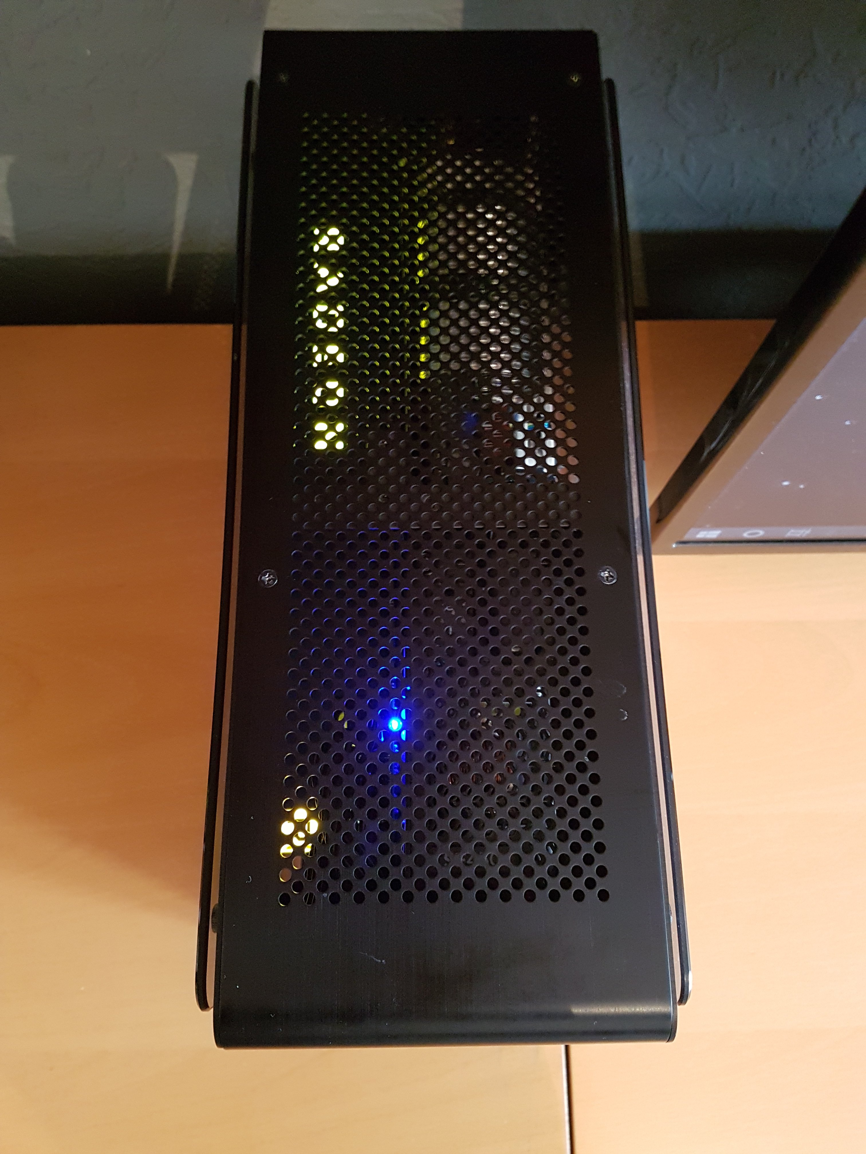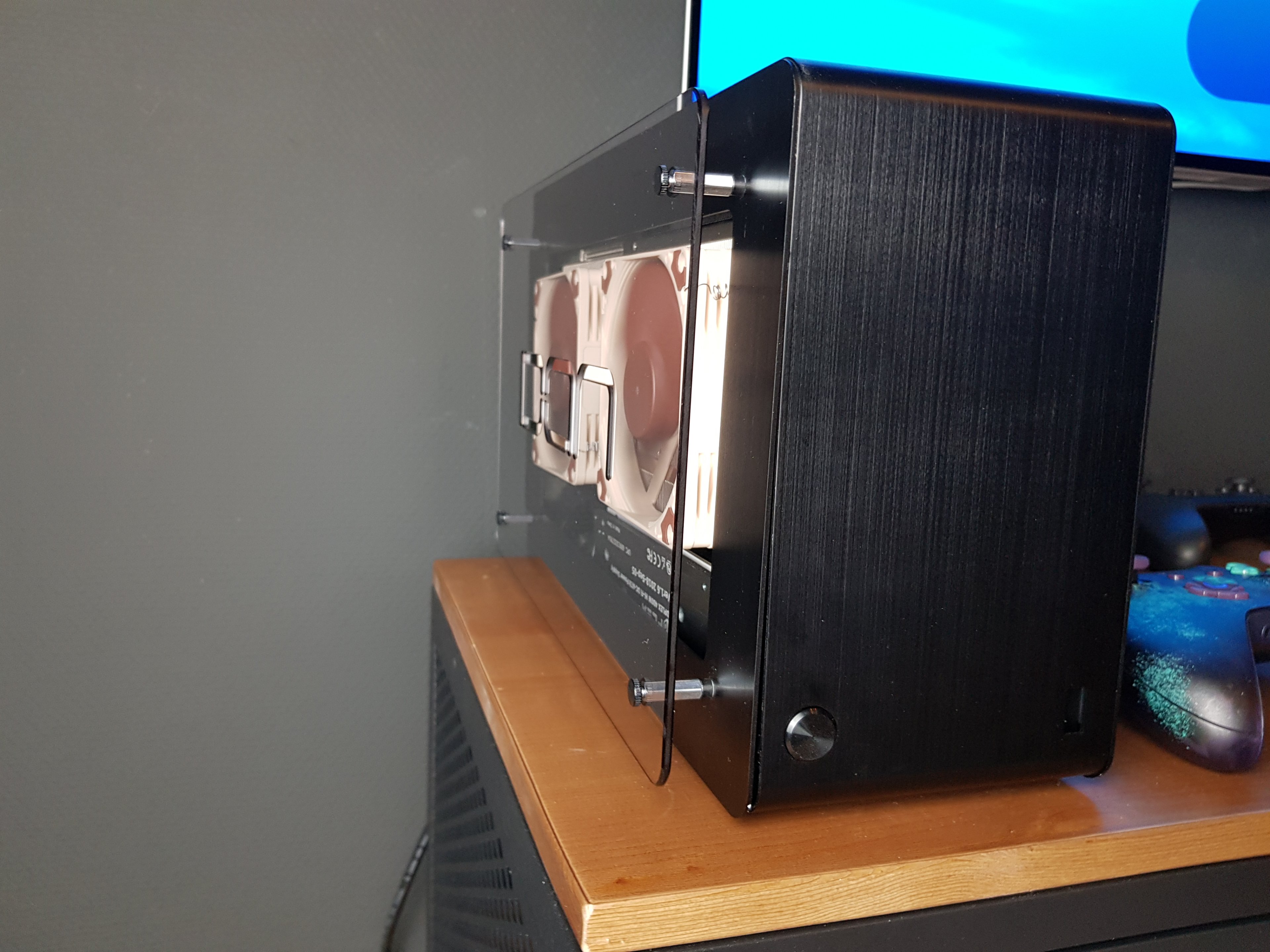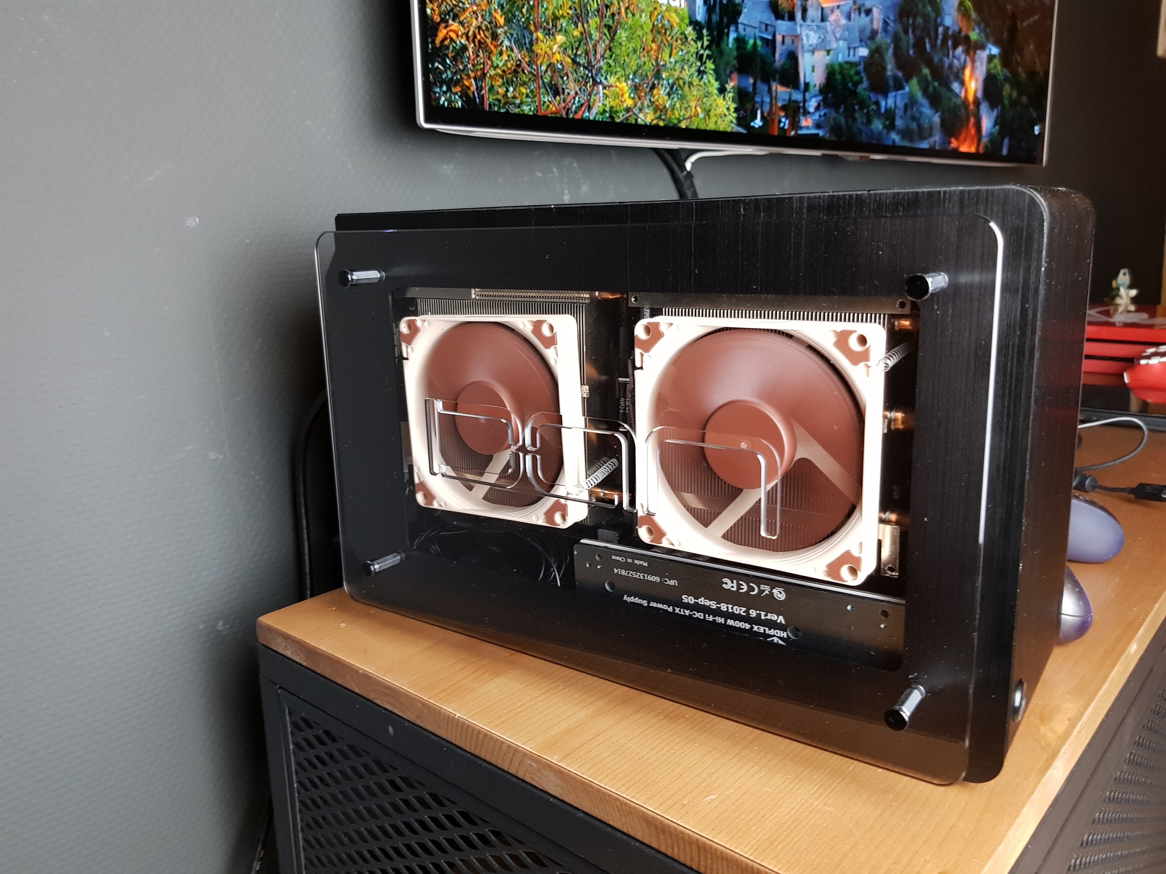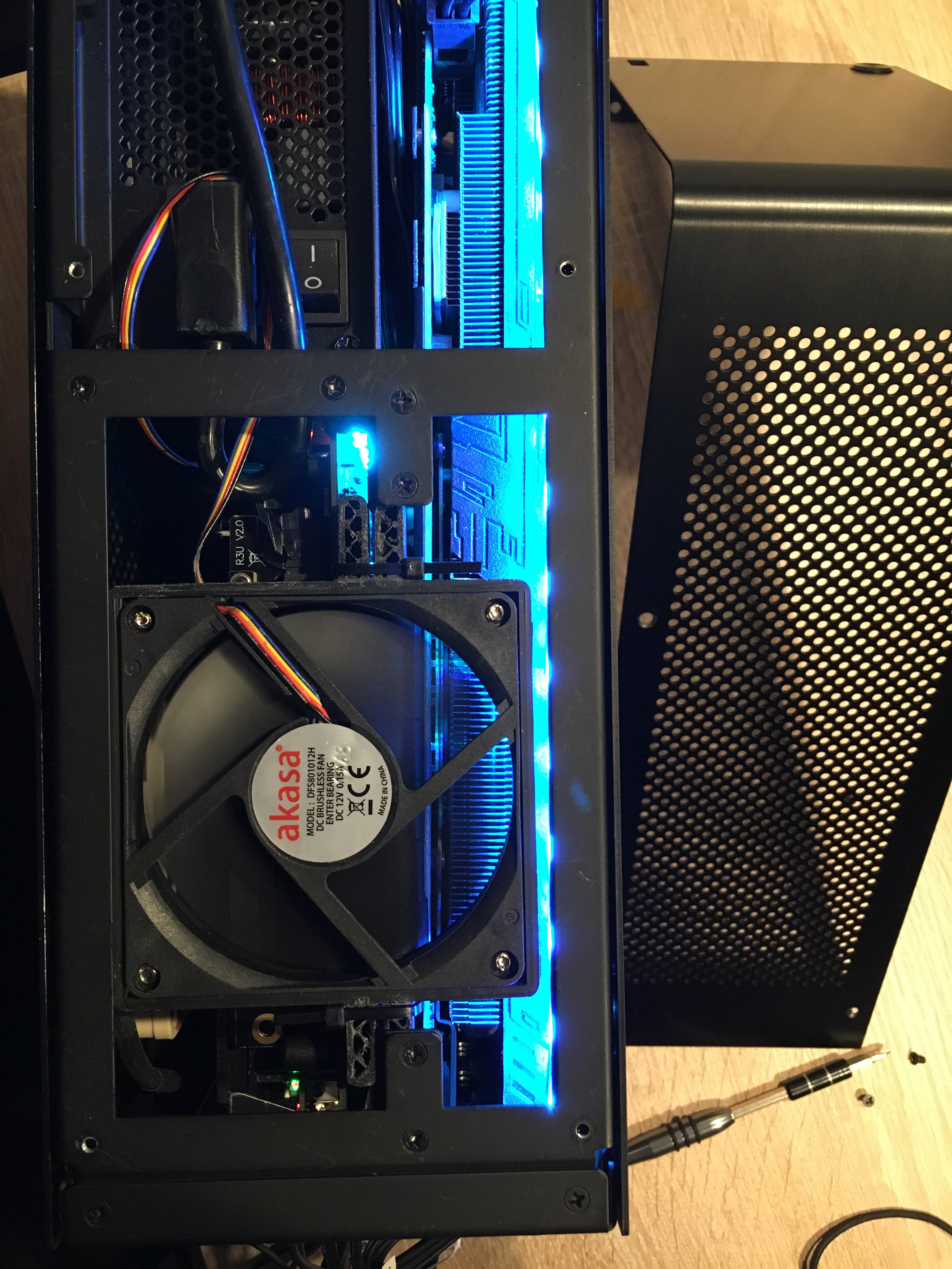 Ich habe hier auf Thingiverse noch einen interessanten Adapter gefunden, um den Akasa Slimfan (80mm x 10.8mm) unter den Deckel zu mounten. Scheint nur etwas Gefummel nötig, damit das PCIe-Riserkabel nicht am Lüfter schleift.