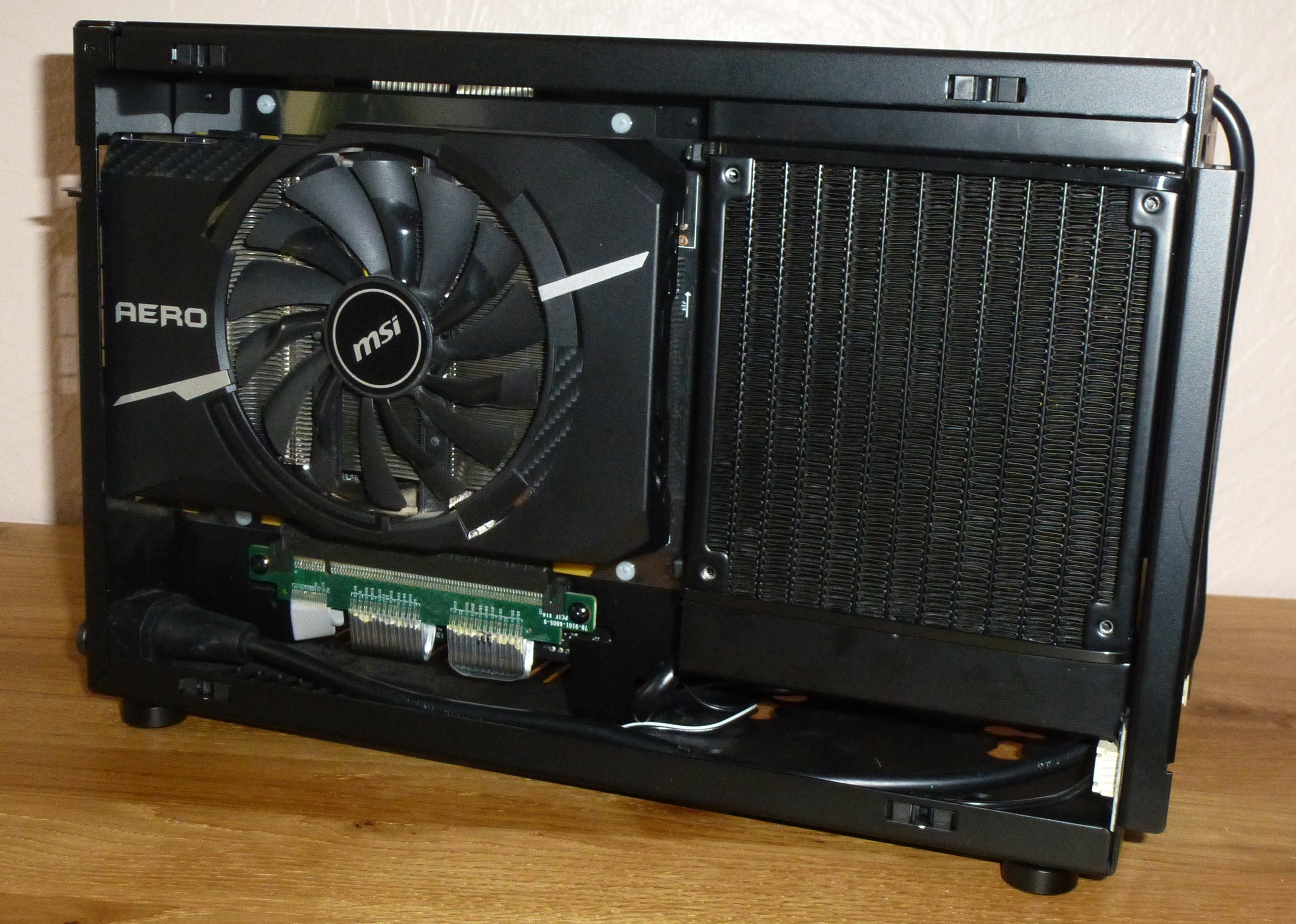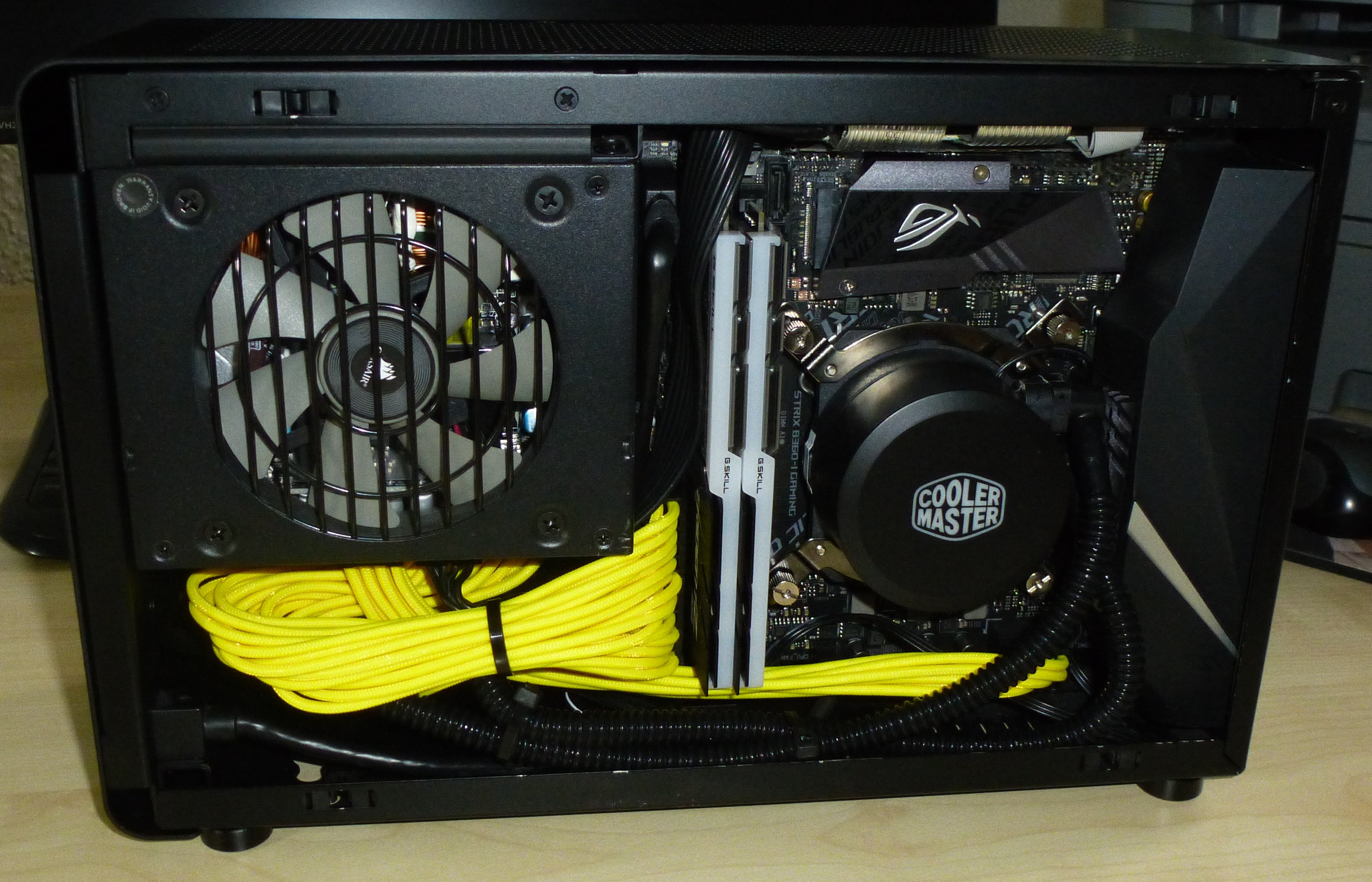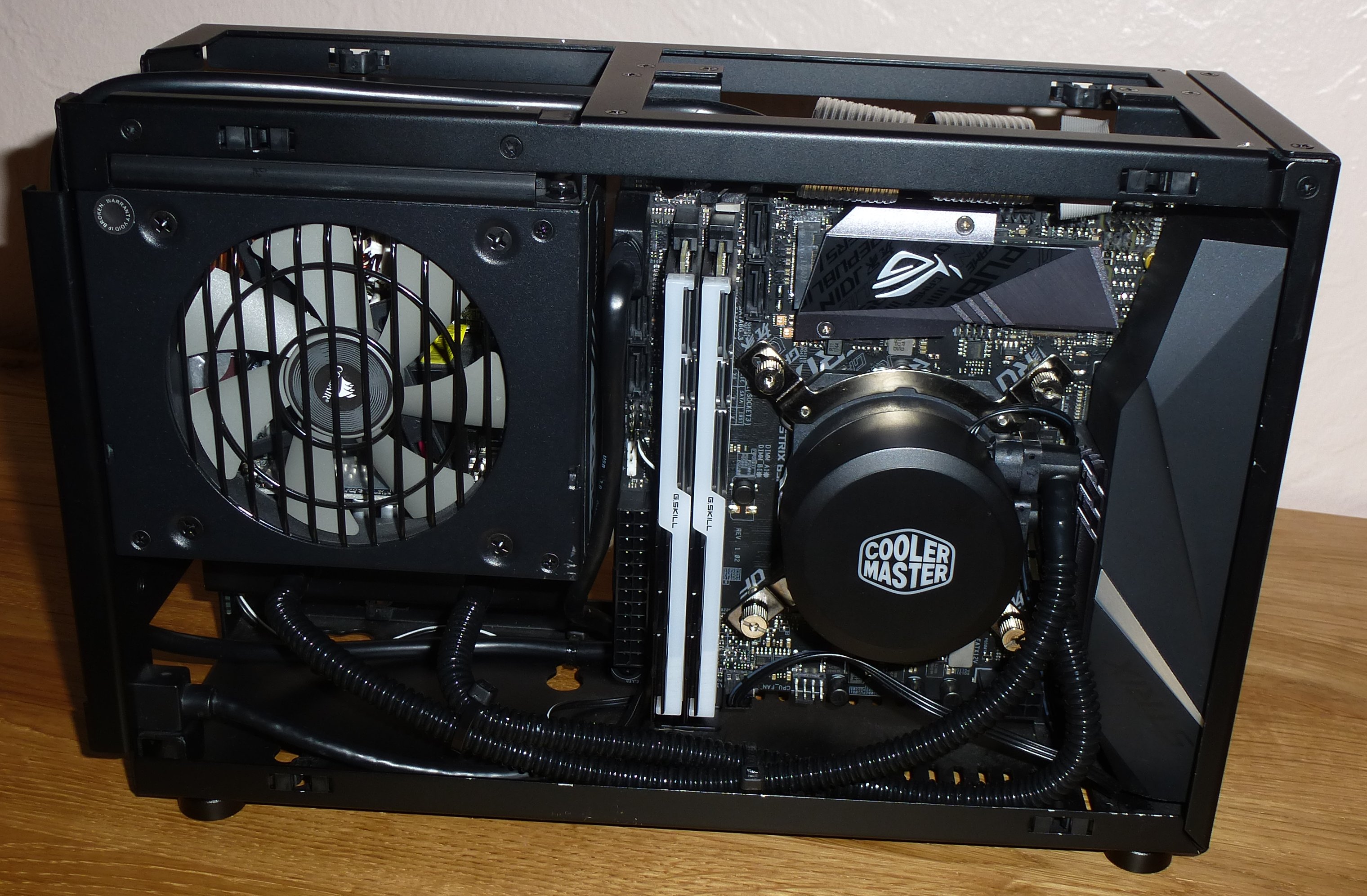 Ich habe mal wieder ein wenig gebastelt und in mein DAN v1 eine 120mm AIO-Wasserkühlung (Cooler Master Liquid Life 120) eingebaut. Da keine Blende für die AIO (wie beim v3) vorhanden ist, habe ich den Radiator mit Kabelbindern fixiert. Das geht aber so nur, wenn man wie bei mir keine SSD vorne angeschraubt hat - ich wollte auch keine Öffnungen bohren oder das Gehäuse beschädigen. Hatte es noch mit dem Noctua NF-A12x15 als Lüfter probiert, doch da geht die Seitenwand nicht richtig zu, daher habe ich jetzt den Noctua NF-A9x14, der ja auch etwas schmaler ist, montiert. Das Ergebnis - bis das v4 da ist - kann sich zumindest konzeptionell einigermaßen sehen lassen. Hier mit Bildern ohne Radiatorlüfter.