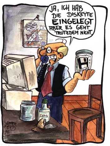 T: (nach einigen Sekunden des angestrengten Überlegens) " Ja wissen Sie, das ist so: das war kein Fehler im Windows, sondern das lag an den Kabel-Kapazitäten durch die Leitungsführung nach vorne, da gab es Störungen, und deshalb wurden bei den Seriengeräten die Stecker für den Bus nach hinten gesetzt, nämlich hierher." (dreht den Rechner um und zeigt mir die USB-Stecker) "Wenn Sie die Stecker an besser erreichbarer Stelle brauchen, können Sie das mit einer Dreiersteckdose machen wie beim Strom, nur daß die etwas mehr kostet" (geht zu einem Regal, will mir wohl einen USB-Hub zeigen, erwischt aber stattdessen einen Ethernet Mini-Hub)