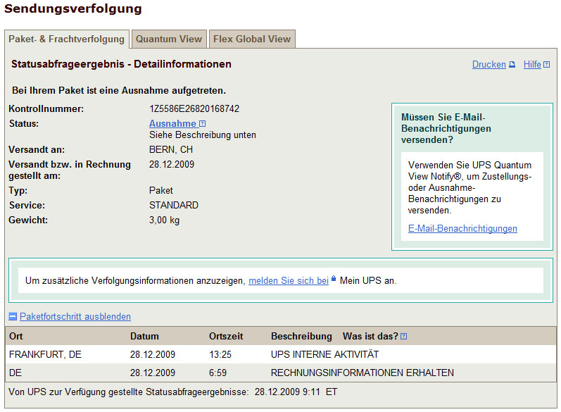 Ich will dich ja nicht demoralisieren, aber meins steht seit dem 10.12 auf versendet, Liefertermin war der 15.12 laut UPS. Versuchte Nachforschungen scheitern bei Dell, da kommen nur Sprüche wie "kommt morgen spätenstens übermorgen" oder "verzögert sich um 2-3 Tage wegen schlechten Wetters". UPS hat da wenigstens schnell kompetent auf meine Anfragen reagiert und erklärt dass der Transport von China nach Frankfurt von Dell organisiert wird, erst ab Frankfurt kommt UPS ins Spiel. Und jetzt hat Dell wohl auch noch zwischen den Jahren zu. Bin mal gespannt wann der Fahrradkurier in Frankfurt ankommt ;-).