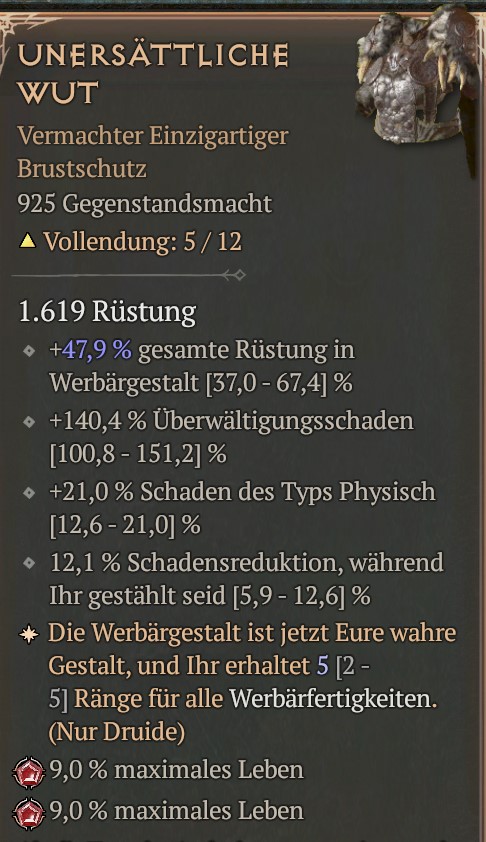 Mein Druide hat momentan einen RĂŒstungswert von 13.862, das kommt von + 47,9% RĂŒstung in WerbĂ€rgestalt auf der Brust (UnersĂ€ttliche Wut, 5/12). In der Stadt sind es dann 9.376. Ich gehe mal davon aus, dass das aufgrund der Caps viel zu hoch ist, und sich nicht auswirkt.