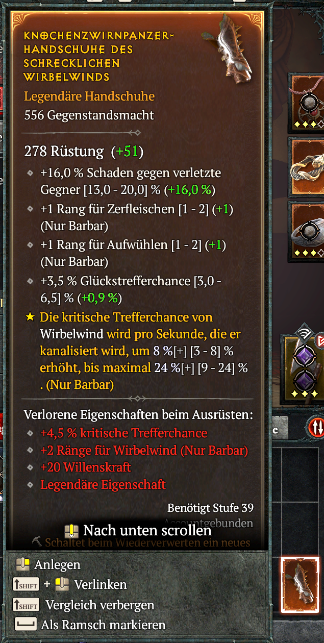 Also so etwas definitiv aufheben?Sturmwind80 schrieb:Kommt drauf an. Für andere Klassen lohnt das durchaus, aber nur bei den Aspekten die keine Zahl von/bis haben. Die Prozentwerte bleiben immer gleich, egal ob der Aspekt Level 10 oder Level 99 ist. Nur wenn du einen Level 99 Aspekt auf ein Level 10 Item rollst, kannst du das Item erst ab Level 99 nutzen.