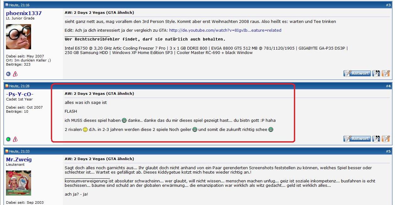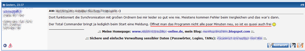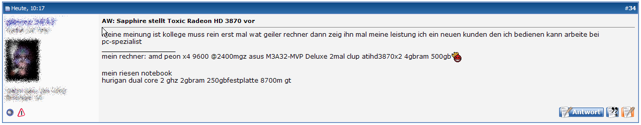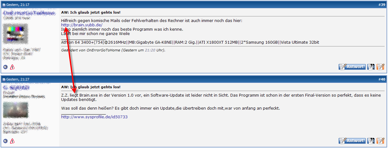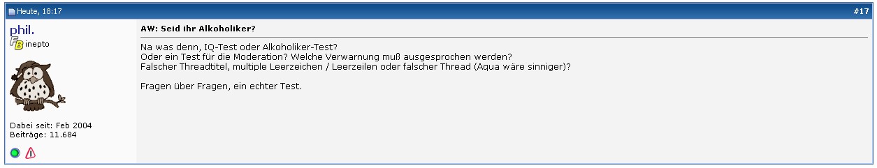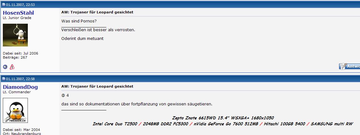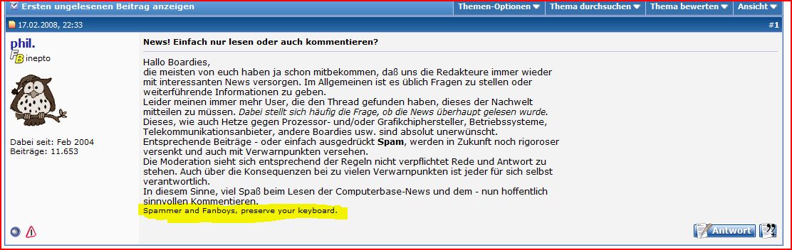 Nicht unbedingt lustig... Eher nicht nachgedacht beim Posten. Erst öffentlich indirekt den Diebstahl (die Weiterverwendung von Shareware nach Ablauf der Testlaufzeit) zugeben und in der Signatur die eigene Homepage inkl. Impressum mit Postanschrift verlinken...