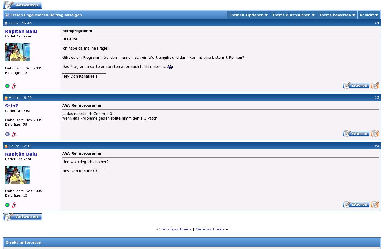 Ich find den Beitrag leider nicht mehr, aber war hier bei FB. Ich wahr schon hundemüde als ich das gelesen habe, und die Antwort kamm so trocken rüber, ich hätte mich fast weg geworfen