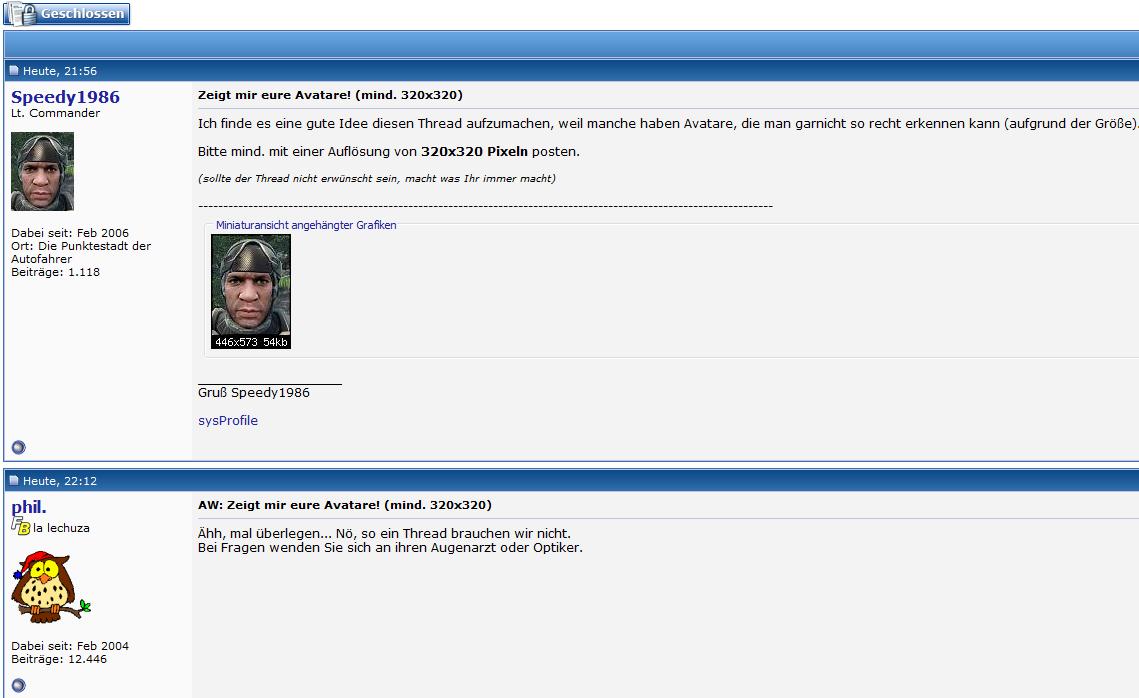 P.S. Ich will keinem in diesem Forum zu Nahe treten oder ihn/sie verletzen. Diese Screenshots dienen lediglich der allgemeinen Belustigung und bei peinlichen/persönlichen Screens werden die User so gut es geht unkenntlich gemacht!