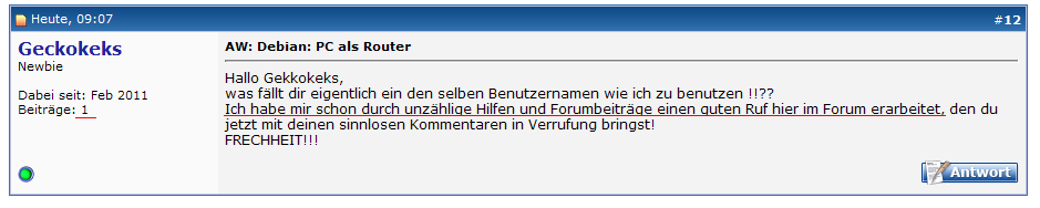 Da hab ich natürlich zuerst einmal geguckt wie ein Auto. Ich hatte das Rätsel nämlich heute morgen nach korrekter Antwort eines lieben Boardies ordnungsgemäß aufgelöst. Der andere Boardie behauptete aber nun, er hätte die Lösung schon viel früher gegeben und zwar schon im Post vor meinem Foto/Rätsel (siehe angehängter Screenshot). Das muss man sich mal vorstellen!? Ich bin dieser Ungeheuerlichkeit natürlich sofort sorgfältig auf den Grund gegangen und habe clevererweise festgestellt, dass sein Post erst heute nachmittag noch einmal von ihm geändert wurde. Angeblich wegen einem "Schreibfehler".