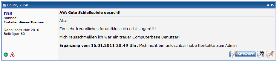 Ein Forumstroll gab damit an, dass einer neuer Account in 40 Sek erstellt ist, nachdem man gebannt worden ist.
