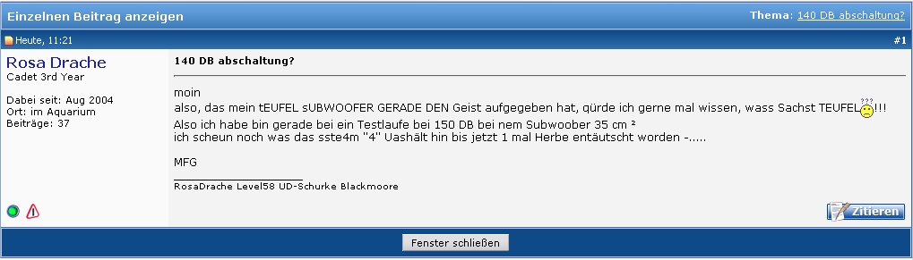 Da bleibt die Frage: Was will er uns damit sagen? Hat er seinen Teufel-Subwoofer in einen 35cm² kleinen Raum gesperrt und war dann von 150db enttäuscht? Oder war einfach sste4m zuviel für ihn? Oder er dachte sste4m müsste sste1m heissen. Man weiß es nicht genau...