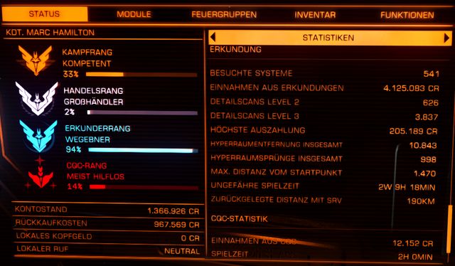 (Bis jetzt) bin ich offenbar auch noch Erstfinder. Mal gucken und hoffen, daß das so bleibt, bis ich zurück bin - irgendwann. Das System hier gibt satt-fett Kohle - könnte glatt meinen bisherigen Rekord von 205.000 Credits für ein einzelnes System sprengen
