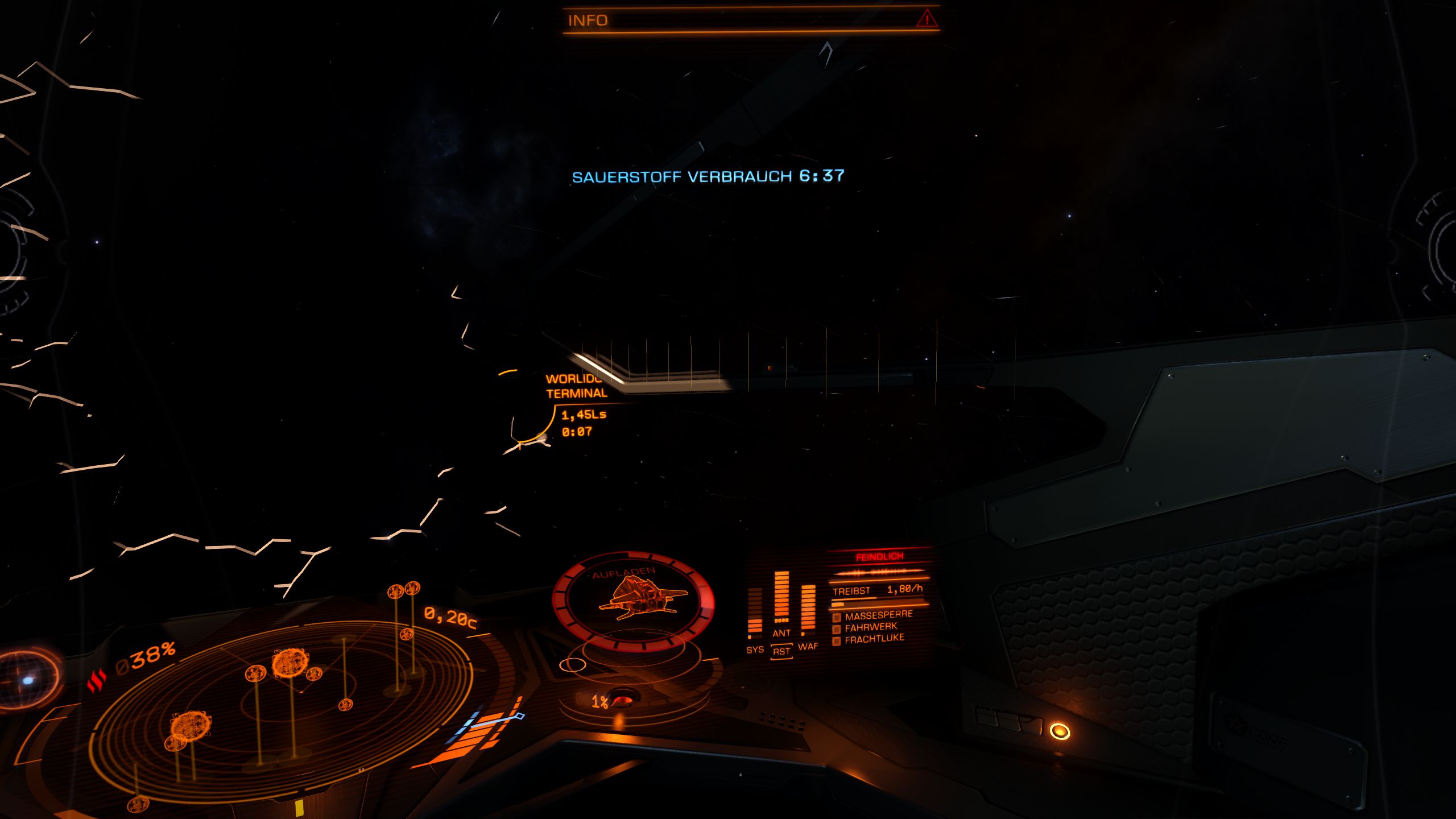 Wieder wertvolle Sekunden vergangen, bis ich das Schiff über den Radar ausgerichtet hatte - vor allem, weil die Kanzel bereits zerbrochen war und ich durch das kaputte HUD da nix mehr sehen konnte.