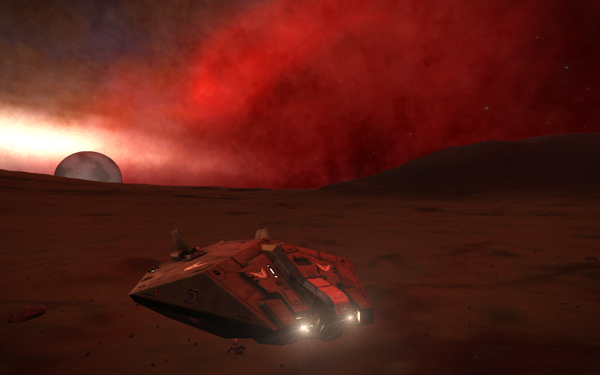 Die nächste Sonne war eine Klasse L oder T Sonne, daher nicht sonderlich hell und dazu noch nichtmal aufgegangen(knappt unterhalb des Horizontes nach dem Landen). Das rote Licht stammt ausschließlich vom Nebel denke ich mal. Ggf. mit Reflexionen der 3 Sonnen in dem System 2 Klasse M und eine Klasse L oder T halt.