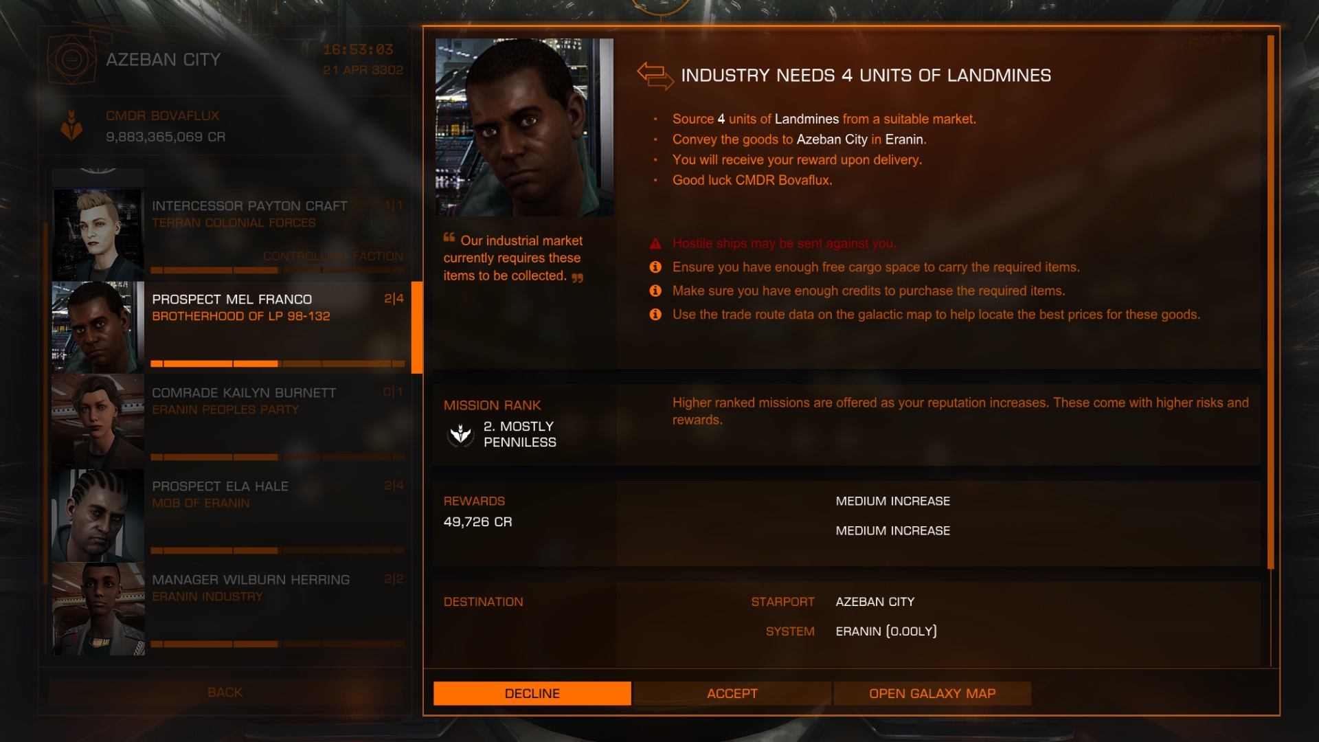 Nervig sind auch diese alternativen Missionsgeber. Gerade eben wolle jemand das ich meine 230.000 Credits Mission für eine Belohnung von 1.537 Credits aufgebe. Das war ne verfluchte Beleidigung, der NPC macht jetzt keine Angebote mehr. Und er kommt auch nicht mehr nach Hause. Sollte sich das nächste Mal vielleicht doch kein Anarchiegebiet aussuchen wenn er andere mit seinen Angeboten beleidigen will.