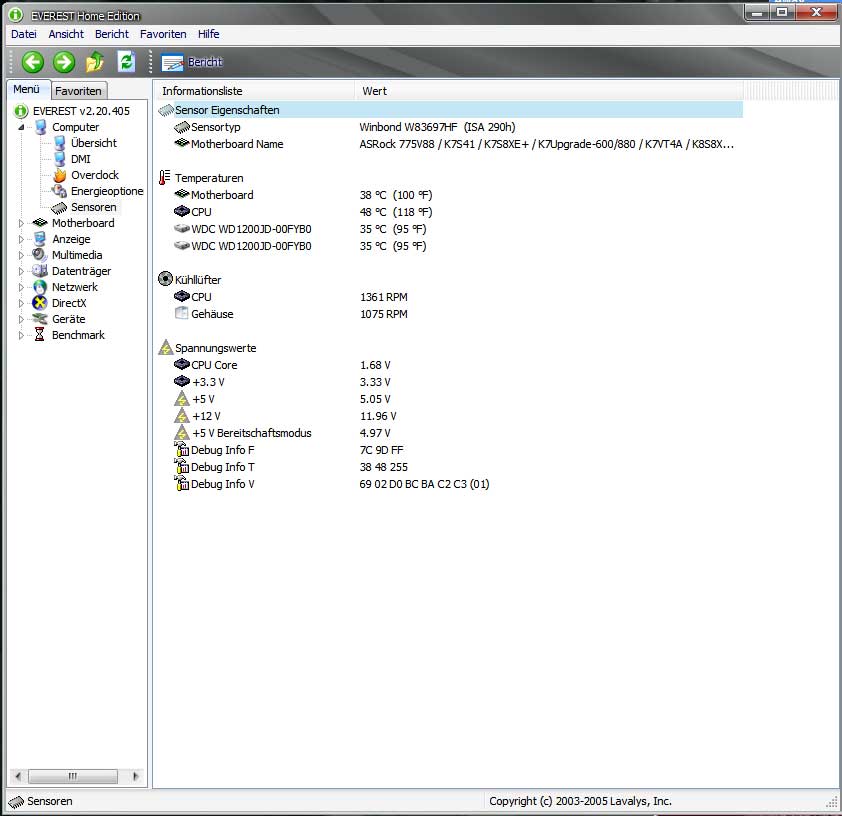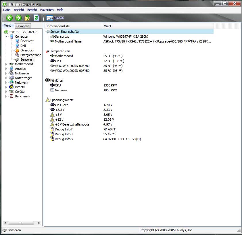 Hier kommen alle Kühler und Lüfter hinein, bei letzteren generell deren Drehzahlen und wenn möglich die Spannungen, sofern eine Lüftersteuerung oder eine Drosselung per Kabel genutzt wird. Die Drehzahlen der am Mainboard angeschlossenen Lüfter können per Everest ausgelesen werden.
