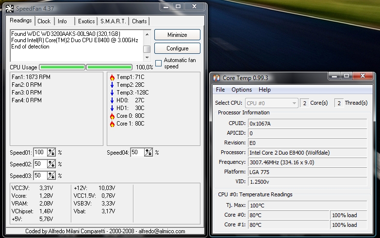 Also: Core 2 Duo E8400 ( E0) wird bei mir unter Last 80°C + .