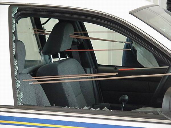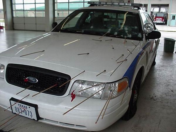 Noch nie CSI gesehen? Die Stäbe sind dazu da um zu rekonstruieren, von wo und aus welchem Winkel Schüsse auf das Polizei Auto abgefeuert wurden. Und wie man sehen kann wurde das Auto ganz gut durchsiebt, würde an ein Wunder grenzen wenn die Insassen überlebt haben