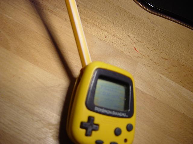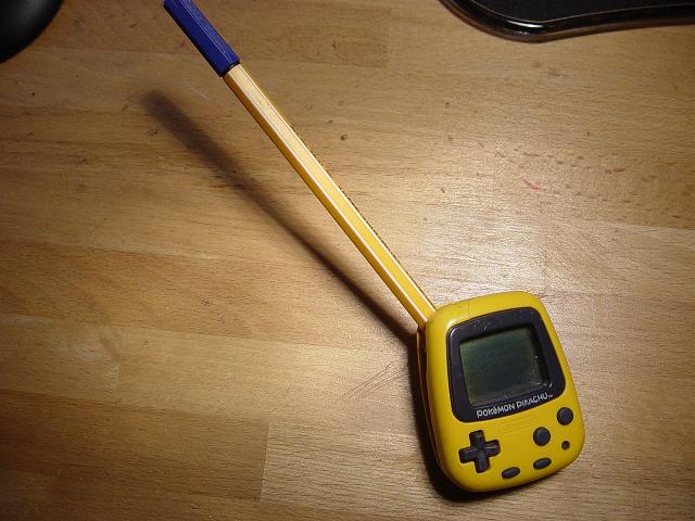 ein experiment: einen alten "pikachu-tamagochi" mit einem stabilo zerschrottet.