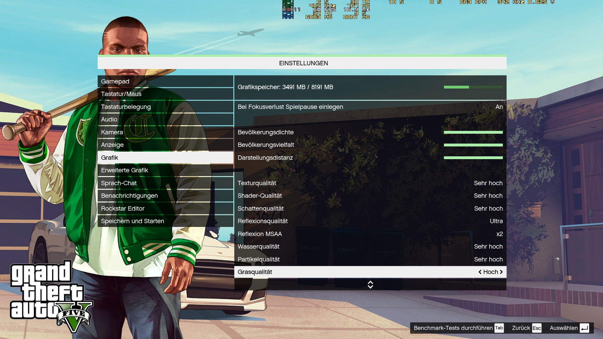 Grafikleistung am besten sparen: MSAA runterdrehen, Skalierung/DSR runterdrehen, Gras runterdrehen (hoch reicht)