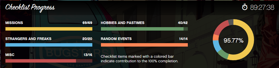 89 1/2 Stunden und 95,77%. (GTA Online Level erst 25.)
