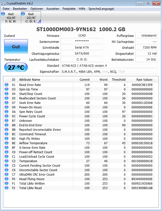 - Spin-Up Time: 97 - ist schlechter als meine 6 Jahre ältere Seagate (98). Der Wert war auch vorher bei 98 (ich meine sogar das er auch bei 100 war).