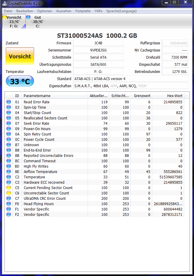 - Seek Error Rate: 60. - war auch mal bei 100 - die alte HDD ist auch hier besser, war aber auch schon auf 60.