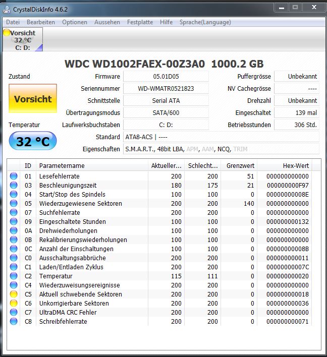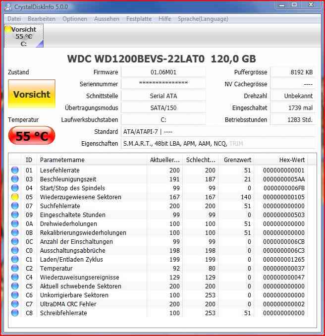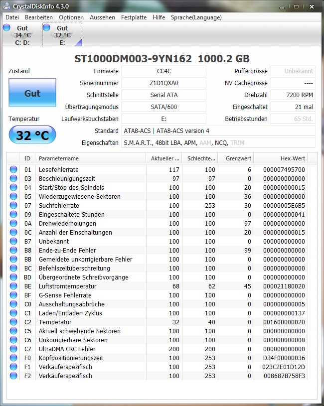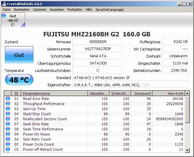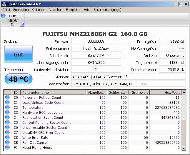 Die beiden Screenshots von CrystalDiskInfo zeigen die Smart-Werte meiner 160er HDD.