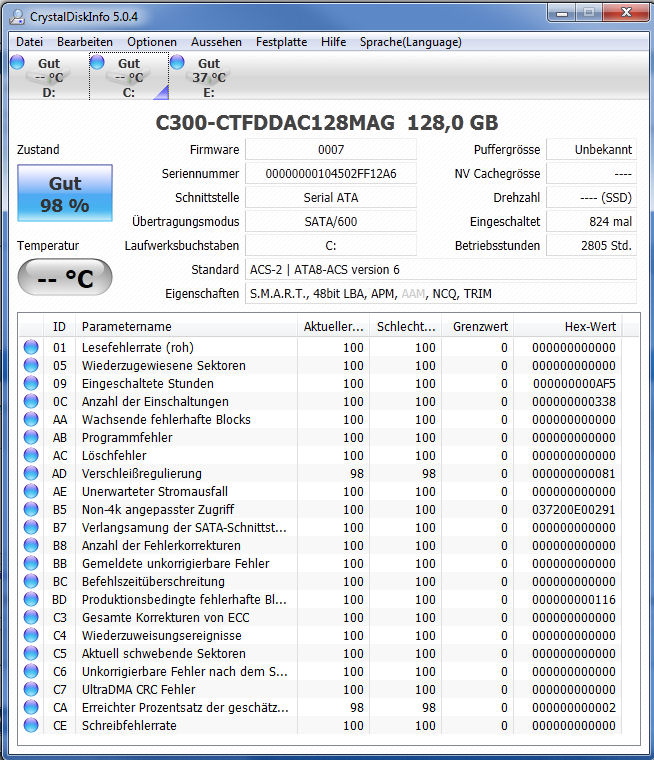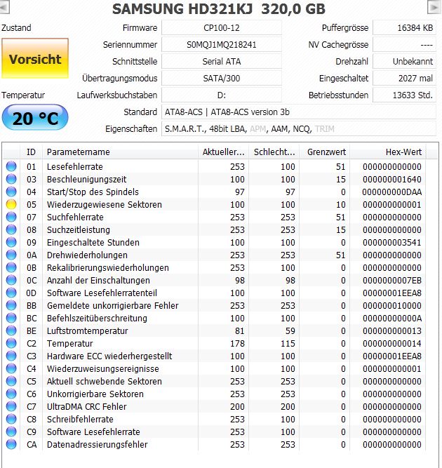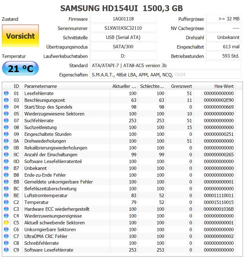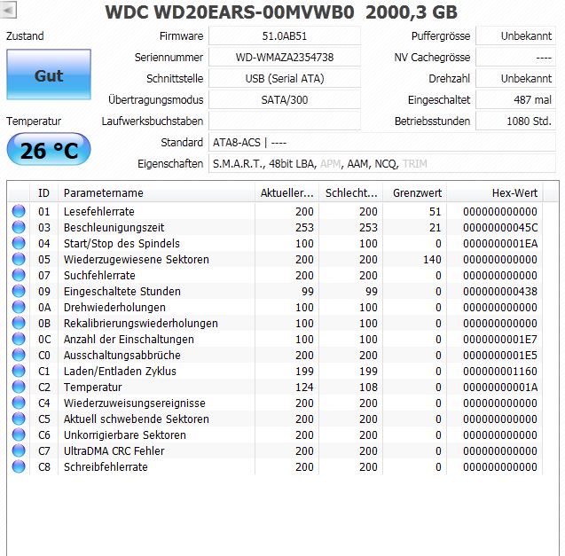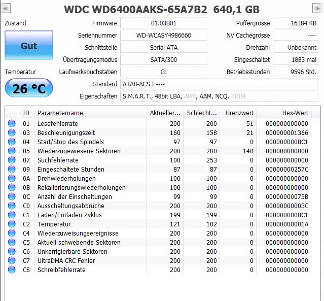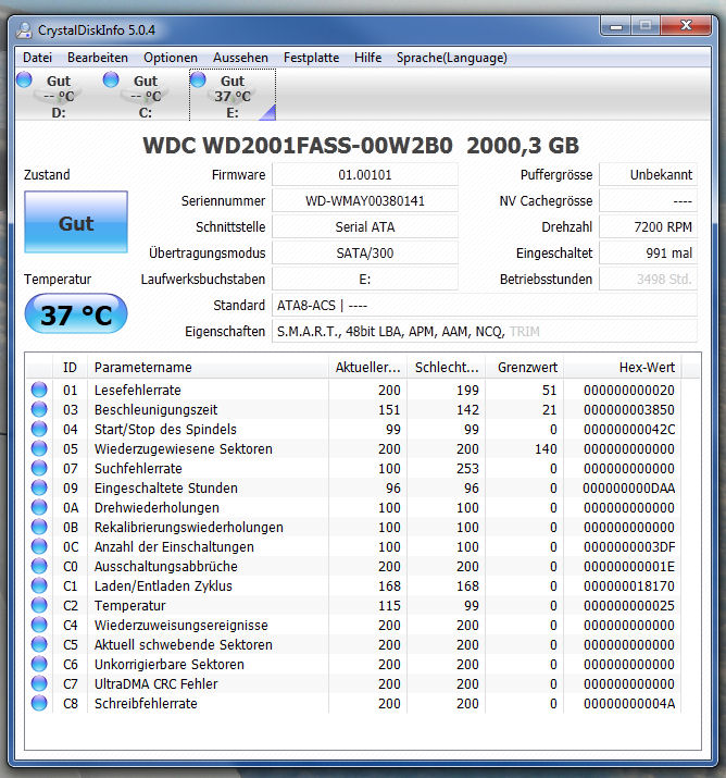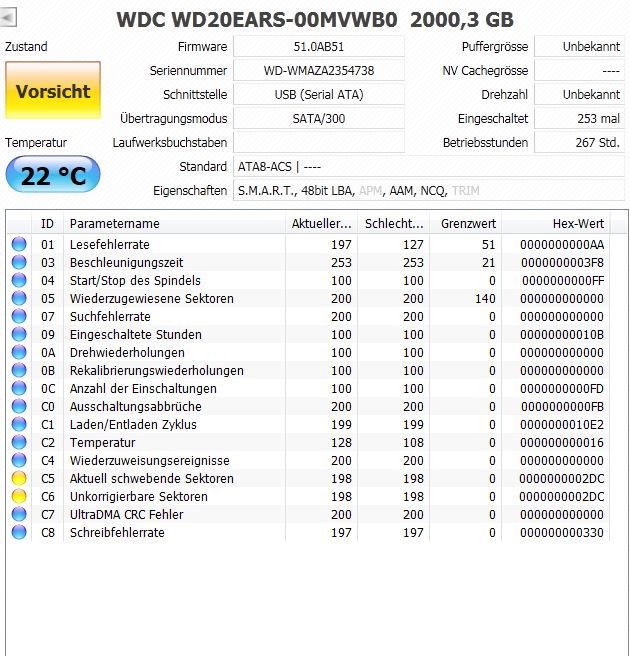 Bei der HDD2, einer WD Green, habe ich immer bei Schreibfehlerrate im Hex einen Wert zwischen 1 und 4, ganz selten steht dort 0. Was bedeutet dieser Wert bzw woran kann dass liegen? Die Platte hatte mal einen schwebenen Sektor der Verschwand vor Monaten nach einem Format und kam nie wieder.